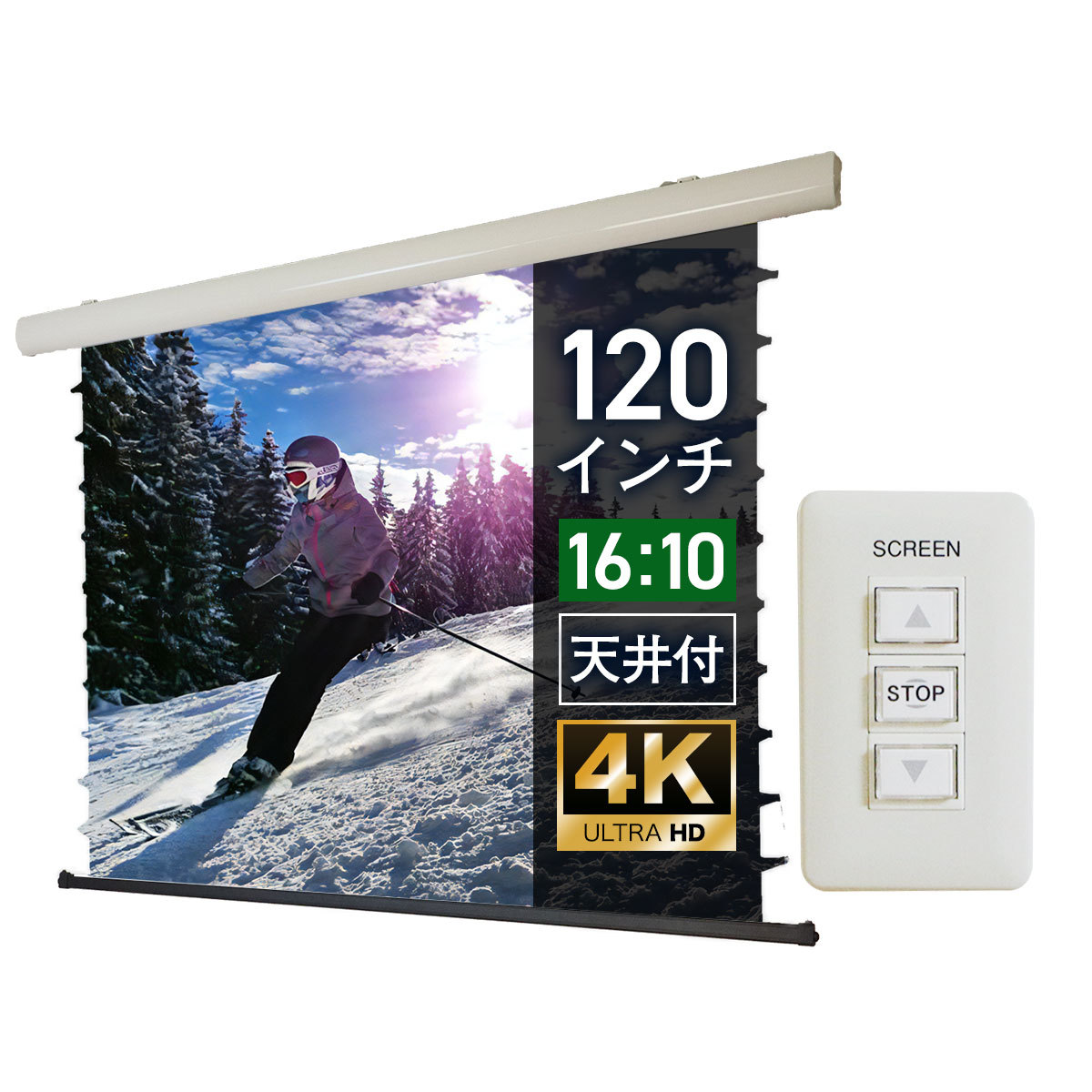 赤外線リモコンと壁埋め込みスイッチ両操作に対応に対応しております。ご希望の操作方法にて設置可能です。スクリーンから離れた位置での操作はリモコンで、確実にスクリーンを操作したい場合には壁スイッチと併用利用も可能です。