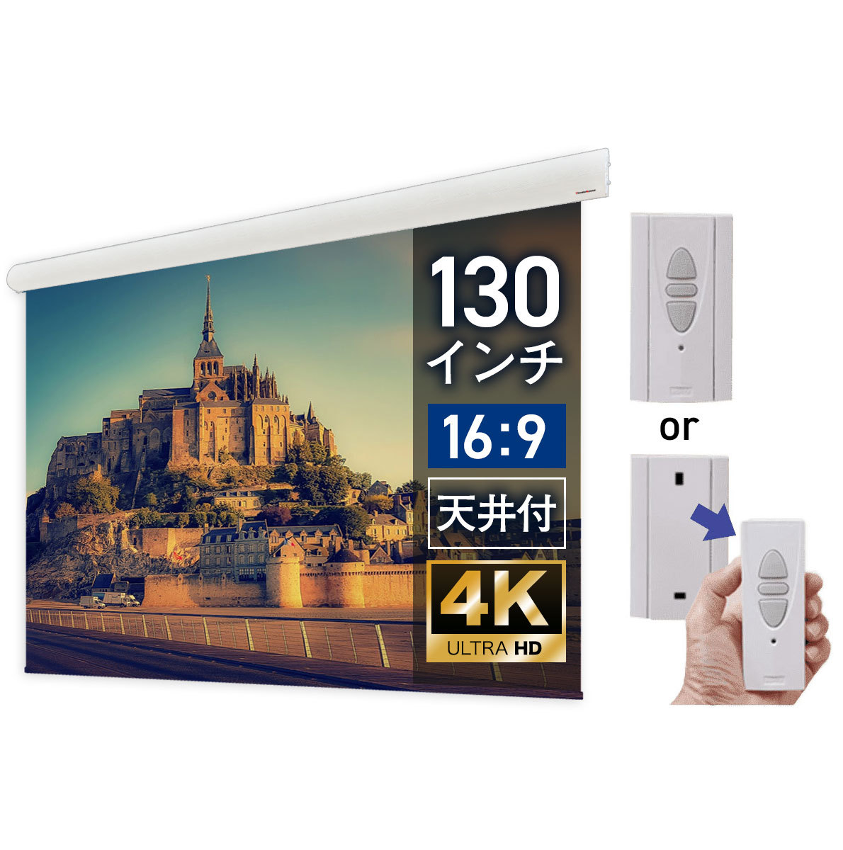 130インチ(16:9) フルハイビジョン、4Kプロジェクターに対応したハイビジョンマット2生地を採用。防炎認定。