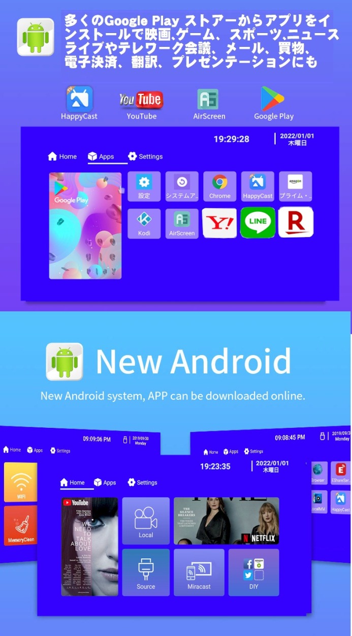 手のひらサイズAndroid TV搭載で色々なアプり使用可能 最近距離省エネ低消費、長寿命LEDプロジェクター