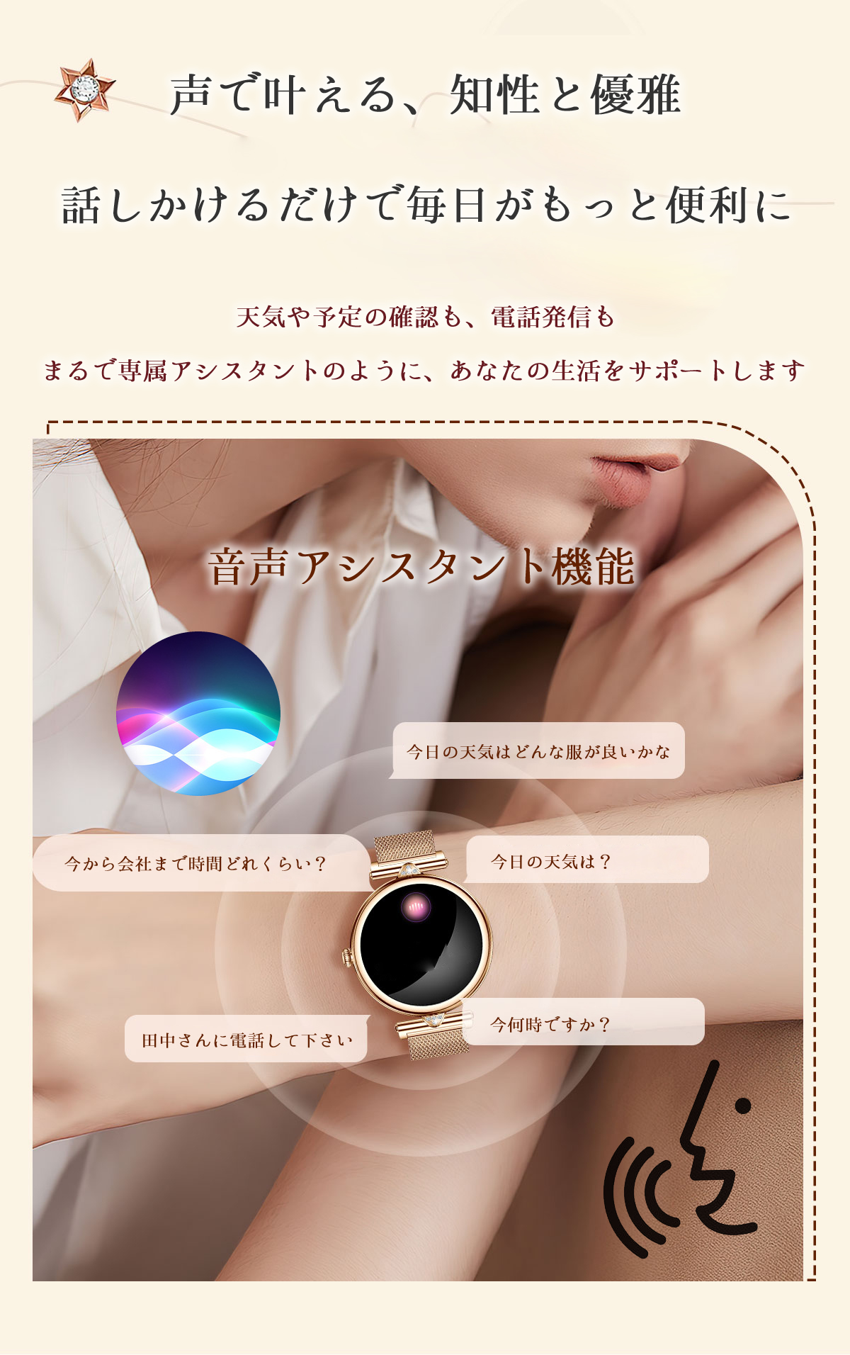 | 機能 | 通話機能、心拍計、睡眠モニター、座りがち、多機能健康管理、着信通知、多種の運動モード、活動量計・運動追跡、アラーム、天気予報、明るさ調節 、ストップウォッチ、タイマー携帯探し、スマートウォッチ携帯探し、生理管理… |