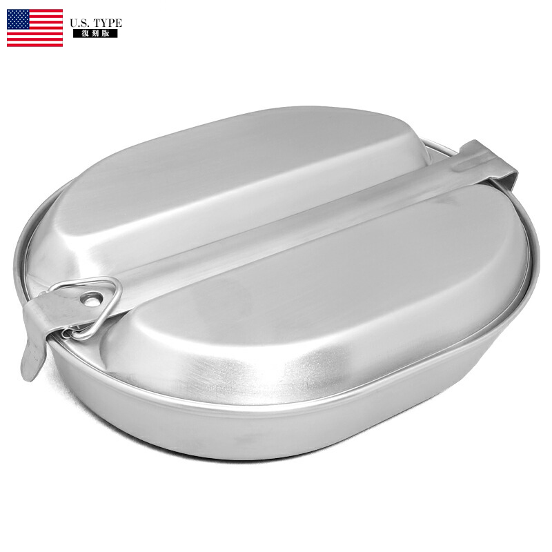 第二次世界大戦中から1990年頃まで使用されていたアメリカ軍のメスキットを忠実に再現しています。野営を前提とした焚火での使用を想定し、持ち手は熱くなりにくいよう長めに作られています。フタ部分はトレーとしても使用可能で、本体の持ち手の上へ乗せる事によって一つの大きなプレートのようにもできるため、食事の際も場所をとりません。収納時は持ち手を折りたたんで固定できる他、Dカンを使いぶら下げての持ち運びも可能です。