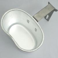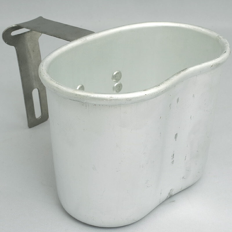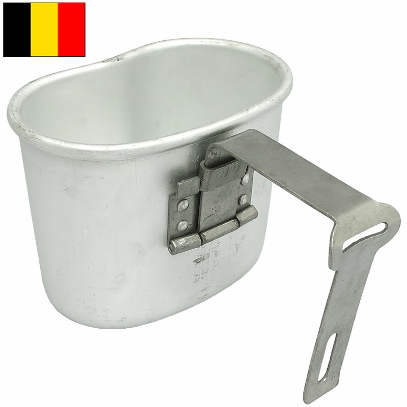 ベルギー軍実物のM56 キャンティーンカップです。米軍M1910キャンティーンに付属のバーハンドルタイプのカップを参考にしているため同じようなデザインで、米軍にて40年代前半まで採用されていたアルミ製でフチが折り返されて丸みのあるタイプに近いものとなっています。使用時はハンドル部分を開いて留め具でロックして使用します。容量は約550mlです。 ※米軍の物よりサイズが若干小さいため米軍1QTキャンティーンははまりません。 |