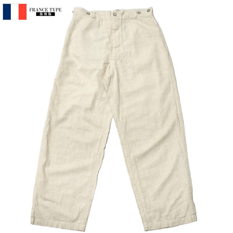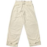 フランス軍でボージョンと呼ばれる被服は訓練、作業用に使用されていました。イギリスやドイツのドリル、アメリカのワーキング(デニム)に相当します。ボージョンの原型は、1873年に採用された炊事兵用の作業着でした。1882年からは訓練、作業着として全兵士に支給されました。過酷な使用環境に耐えるため、頑丈な無漂白のリネン生地が採用され、EQUIPEMENTS MILITAIRESと刻印された合金製ボタンを使用していました。制服の上から着用することを目的としているため、全体的にゆったりしたシルエットで、シンチバックでフィット感を調整できますこれらはもともと戦地で着用する被服ではありませんでしたが、1912年には歩兵にも支給されるようになり、砲兵、列車兵、整備兵などの汚れ作業の多い兵科の兵士達は好んで戦地で着用していました。1938年には後継のボージョンが採用されましたが、在庫分の支給は継続され続け、1940年代以降は海外県や植民地を中心に1950年代まで使用されました。こちらのパンツは、ホスピタルミリタリーを示すHMの刻印や合金製ボタンなど、細かなディテールを忠実に再現。大きめのサイズ感はあえてそのままにしています。ウエスト部分のボタンはサスペンダーに対応しており、着こなしの幅が広がります。