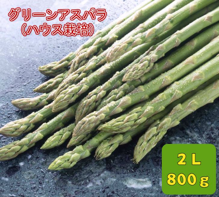 北海道産ハウスグリーンアスパラで、2L(ロングサイズ24cm)800gの商品になります。