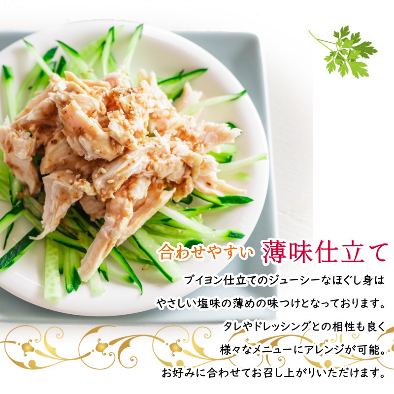 蒸した鶏肉を丁寧にほぐして、薄味のチキンブイヨンと塩味で仕立てました。