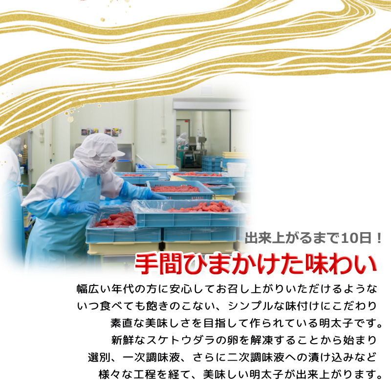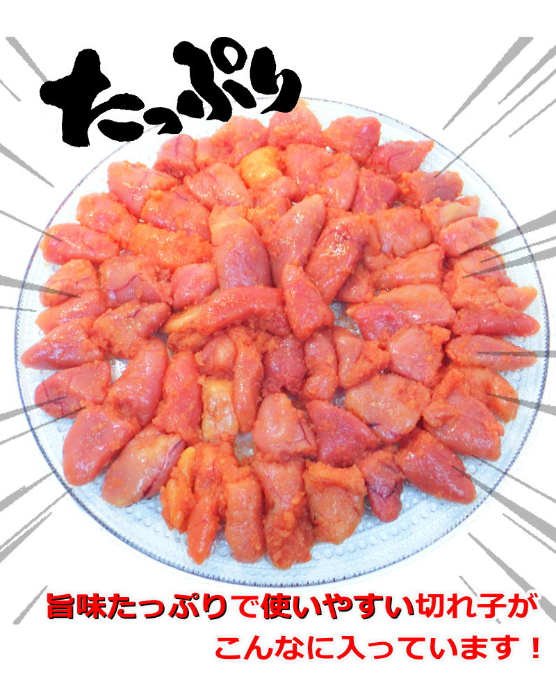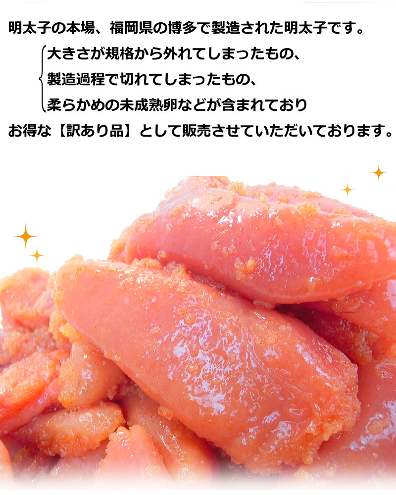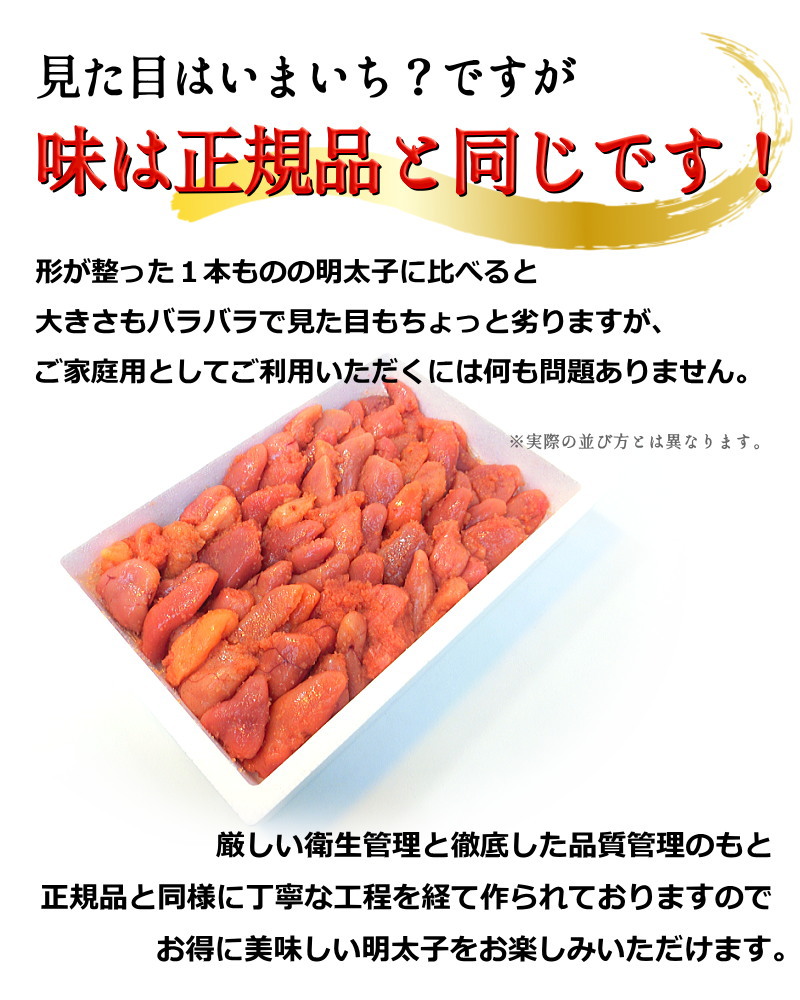 正規品を作る際に出る、切れ子や未成熟卵を含むお得な明太子です。