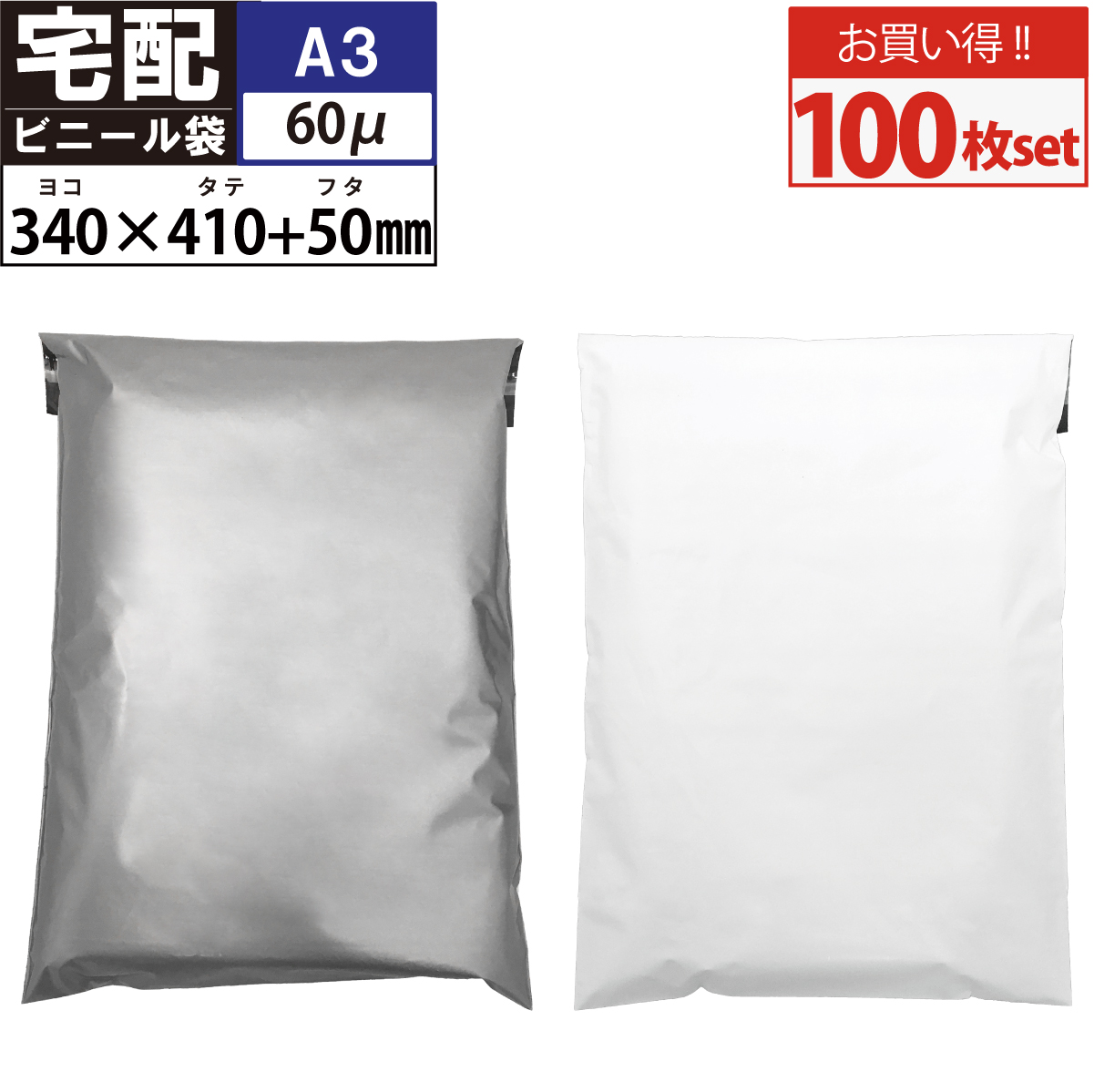 \ランキング1位/宅配用ビニール袋 100枚 テープ付き 巾340×高さ410+フタ50mm A3サイズにピッタリ!梱包 袋 梱包材 宅配袋 ビニール 宅配袋A3 厚み60ミクロン