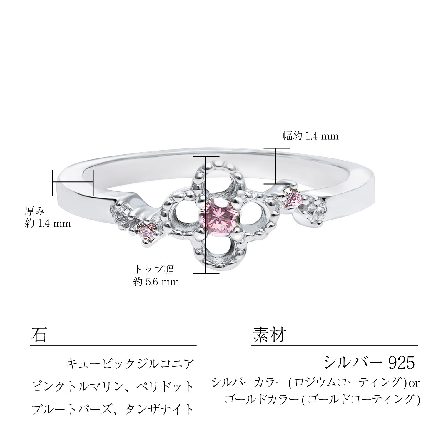 石:ジルコニア・ペリドット/ピンクトルマリン/ブルートパーズ/タンザナイト