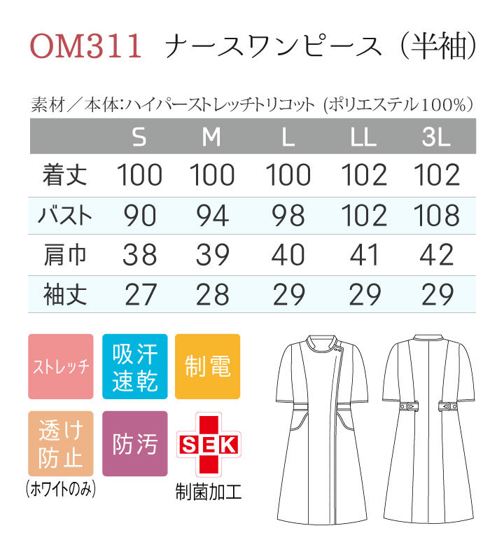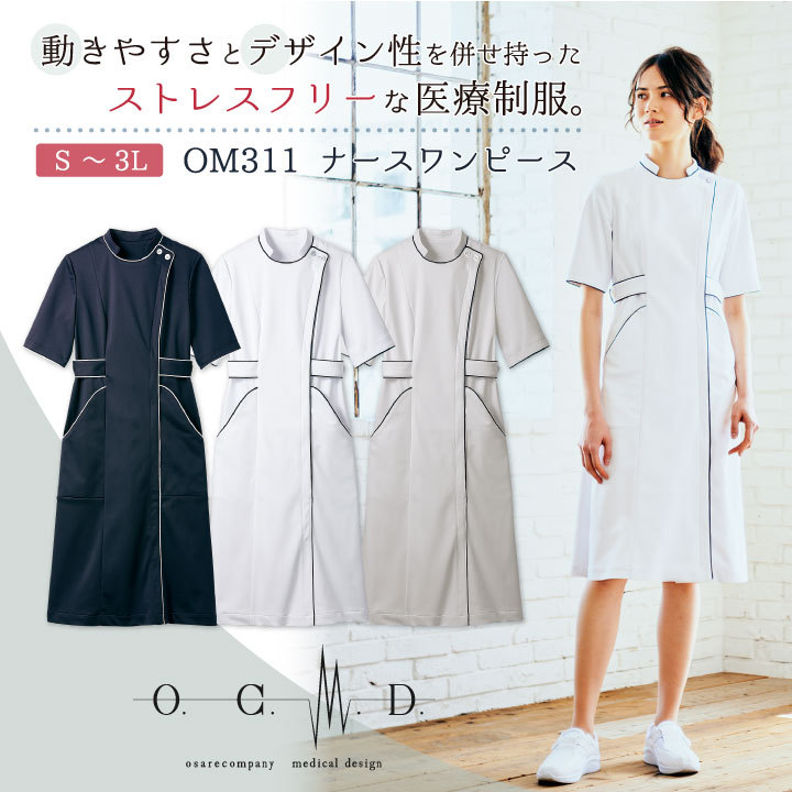 OM302 ナースジャケットは→コチラOM312 ナースワンピースは→コチラOM901 インナーは→コチラ・モニター等の環境による色の誤差や、素材により色ブレが生じる場合があります。
