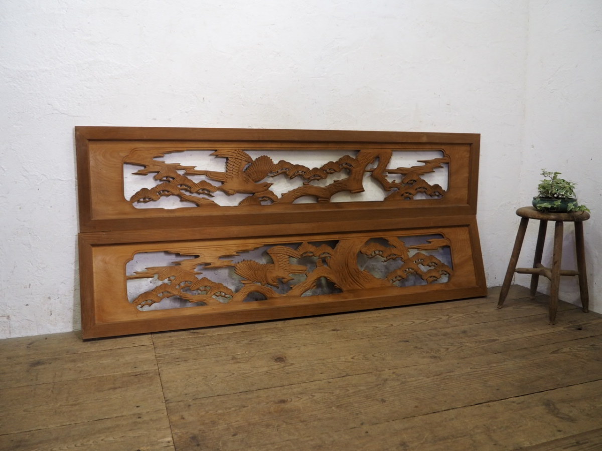商品情報 | ■商品詳細■ レトロな古い木製欄間、2枚セットです。 長年使い込まれた味わいのある品です。 一般のご家庭はもちろん、レトロな店舗什器にもお勧めです。 経年の傷や欠け、染み等がありますが、使用には問題ありません。 古い物とご理解いただければ幸いです。 ご不明な点などありましたら、質問欄にてお願いします。 ■サイズ■ 全体(最大値) (H 37,5cm×W 171cm×D 3cm)×2枚 多少の誤差はご了承下さい。 |