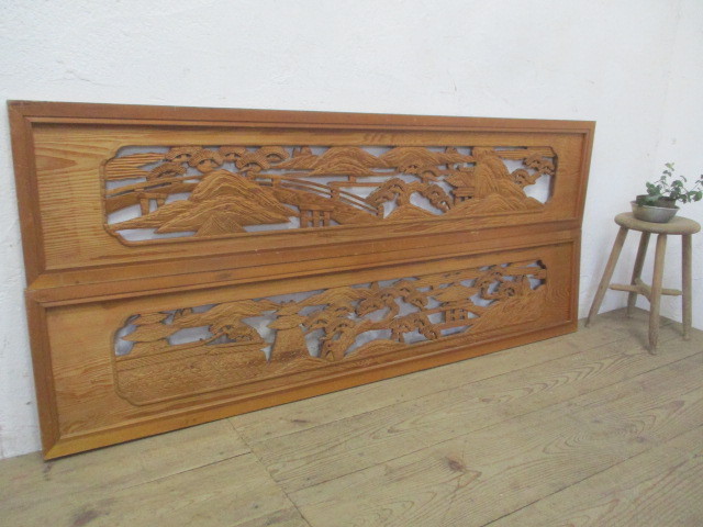 商品情報 | ■商品詳細■ レトロな古い木製欄間、2枚セットです。 木彫り細工のデザインが素敵な品です。 ガラスは無いタイプになります。 一般のご家庭はもちろん、レトロな店舗什器にもお勧めです。 経年の傷や欠け、染み等ありますが、使用には問題ありません。 古い物とご理解いただければ幸いです。 ご不明な点などありましたら、質問欄にてお願いします。 ■サイズ■ 全体(最大値) (H 37cm×W 172,5cm×D 3cm)×2枚 多少の誤差はご了承下さい。 |