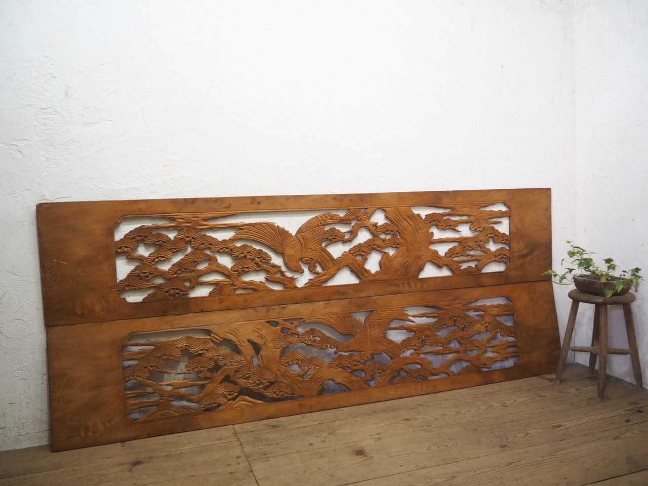 商品情報 | ■商品詳細■ レトロな大きい欄間の素材、2枚セットです。 長年使い込まれた味わいのある品です。 一般のご家庭はもちろん、レトロな店舗什器にもお勧めです。 経年の傷や欠け、染みや木彫りパーツにヒビ、 板部分に欠け等がありますが、使用には問題ありません。 木枠はありませんので、今回は素材として出品させて頂きます。 メンテナンス前提にお考え頂ける方にお願いします。 古い物とご理解いただければ幸いです。 ご不明な点などありましたら、質問欄にてお願いします。 ■サイズ■ 全体(最大値) (H 45cm×W 226cm×D 1,1cm)×2枚 重量 10,5kg 多少の誤差はご了承下さい。 ドライバー1人での配達になりますので、場合(通路が狭い等)によっては 荷運びのお手伝いをお願いすることがあります。 商品は玄関先までの配達になります。 |