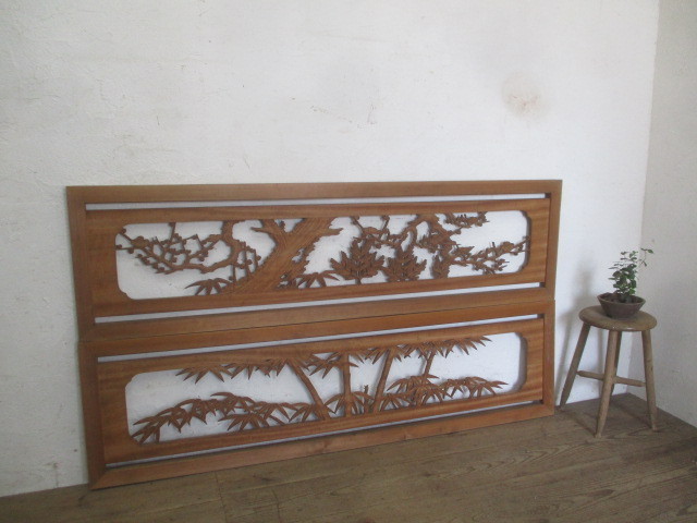 商品情報 | ■商品詳細■ 分厚い彫刻のレトロな古い木製欄間、2枚セットです。 長年使い込まれた味わいのある品です。 一般のご家庭はもちろん、レトロな店舗什器にもお勧めです。 経年の傷や欠け、染みや割れ、古い虫食い等がありますが、使用には問題ありません。 古い物とご理解いただければ幸いです。 ご不明な点などありましたら、質問欄にてお願いします。 ■サイズ■ 全体(最大値) (H 46,5cm×W 170cm×D 3cm)×2枚 多少の誤差はご了承下さい。 |