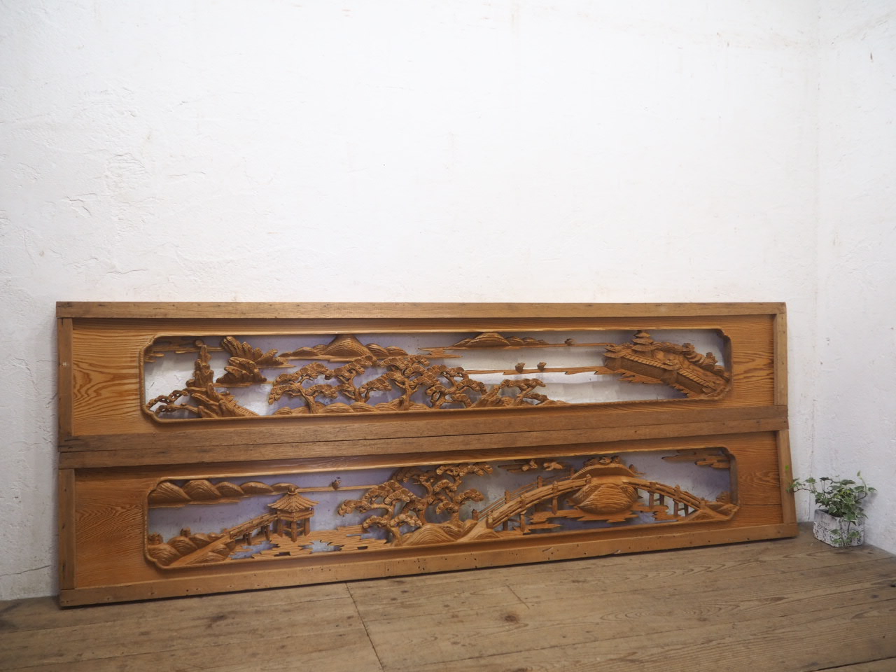 商品情報 | ■商品詳細■ 大きい木製欄間の素材、2枚セットです。 長年使い込まれた味わいのある品です。 なかなか入荷しない希少な特大サイズです。 ガラスは入らない造りです。 一般のご家庭はもちろん、レトロな店舗什器にもお勧めです。 経年の傷や欠け、染みやヒビ、板部分に割れや加工跡の小穴、 古い補修や虫食い、木枠に欠けや緩み等あります。 今回は素材として出品させて頂きます。 実用の際はメンテナンス前提にお願いします。 木枠はサービスでお付けします。 移動中に多少欠けが生じる場合があります。 すみませんが予めご了承ください。 古い物とご理解いただければ幸いです。 ◆別カテゴリーにて、同じ仕入れ先の品(Q0371〜Q0383)を出品していますので まとめてご希望の場合は、ストア内検索で上記の管理番号を検索して頂ければと思います。 売買済みの場合はご了承下さい。 ご不明な点などありましたら、質問欄にてお願いします。 ■サイズ■ 全体(最大値) (H 41cm×W 234cm×D 6cm)×2枚 多少の誤差はご了承下さい。 ドライバー1人での配達になりますので、場合(通路が狭い等)によっては 荷運びのお手伝いをお願いすることがあります。 商品は玄関先までの配達になります。 |