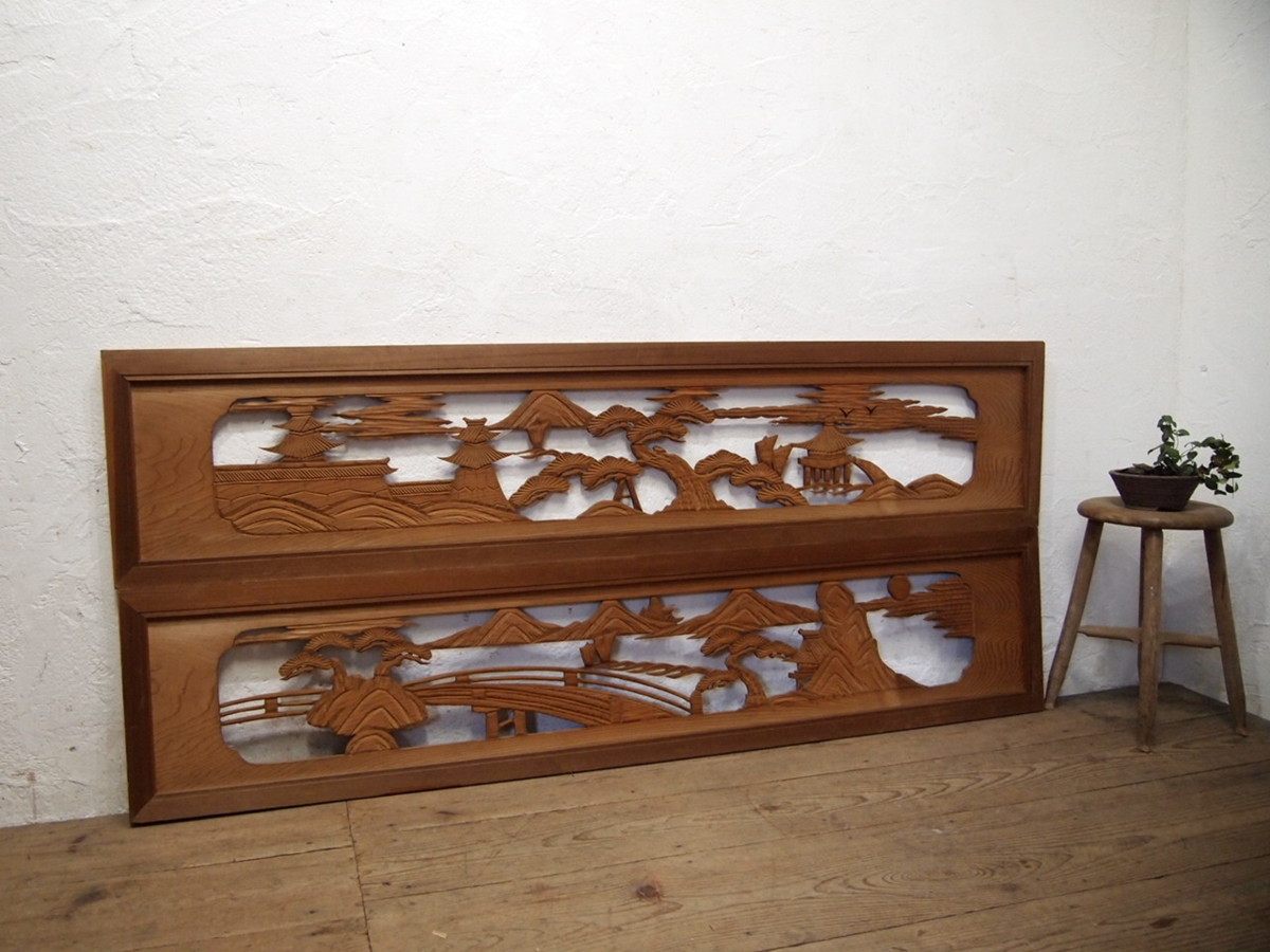 商品情報 | ■商品詳細■ レトロな古い木製欄間、2枚セットです。 長年使い込まれた味わいのある品です。 一般のご家庭はもちろん、レトロな店舗什器にもお勧めです。 経年の傷や欠け、染みや割れ、飾りの割れ等がありますが、 使用には問題ありません。 古い物とご理解いただければ幸いです。 ◆別カテゴリーにて同じ様なデザインの品(R543〜R545)を出品していますので まとめてご希望の場合は、ストア内検索で上記の管理番号を検索して頂ければと思います。 売買済みの場合はご了承下さい。 ご不明な点などありましたら、質問欄にてお願いします。 ■サイズ■ 全体(最大値) H 37,5cm×W 172cm×D 3cm H 37,5cm×W 171cm×D 3cm 多少の誤差はご了承下さい。 |