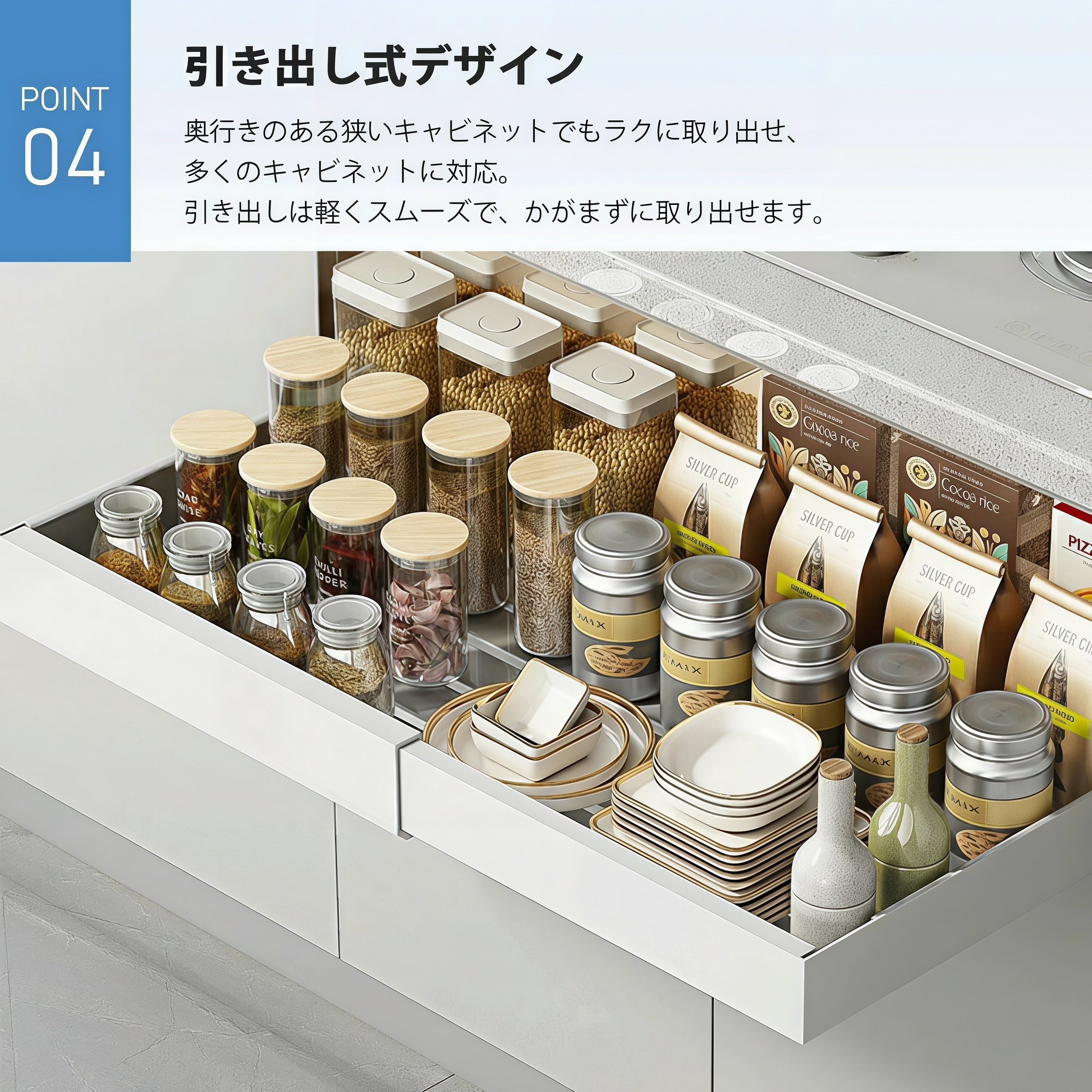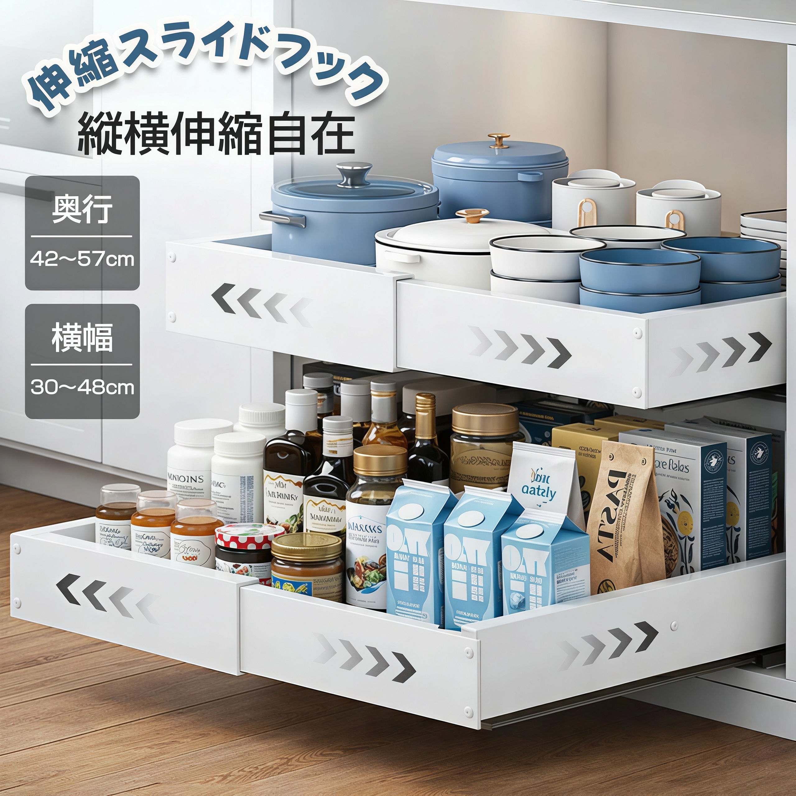 - 異サイズキャビネット対応:幅30~48cm、奥行42~57cmまで伸縮可能で、99%のキャビネットにフィット。レイアウトに囚われない自由な収納が実現。
