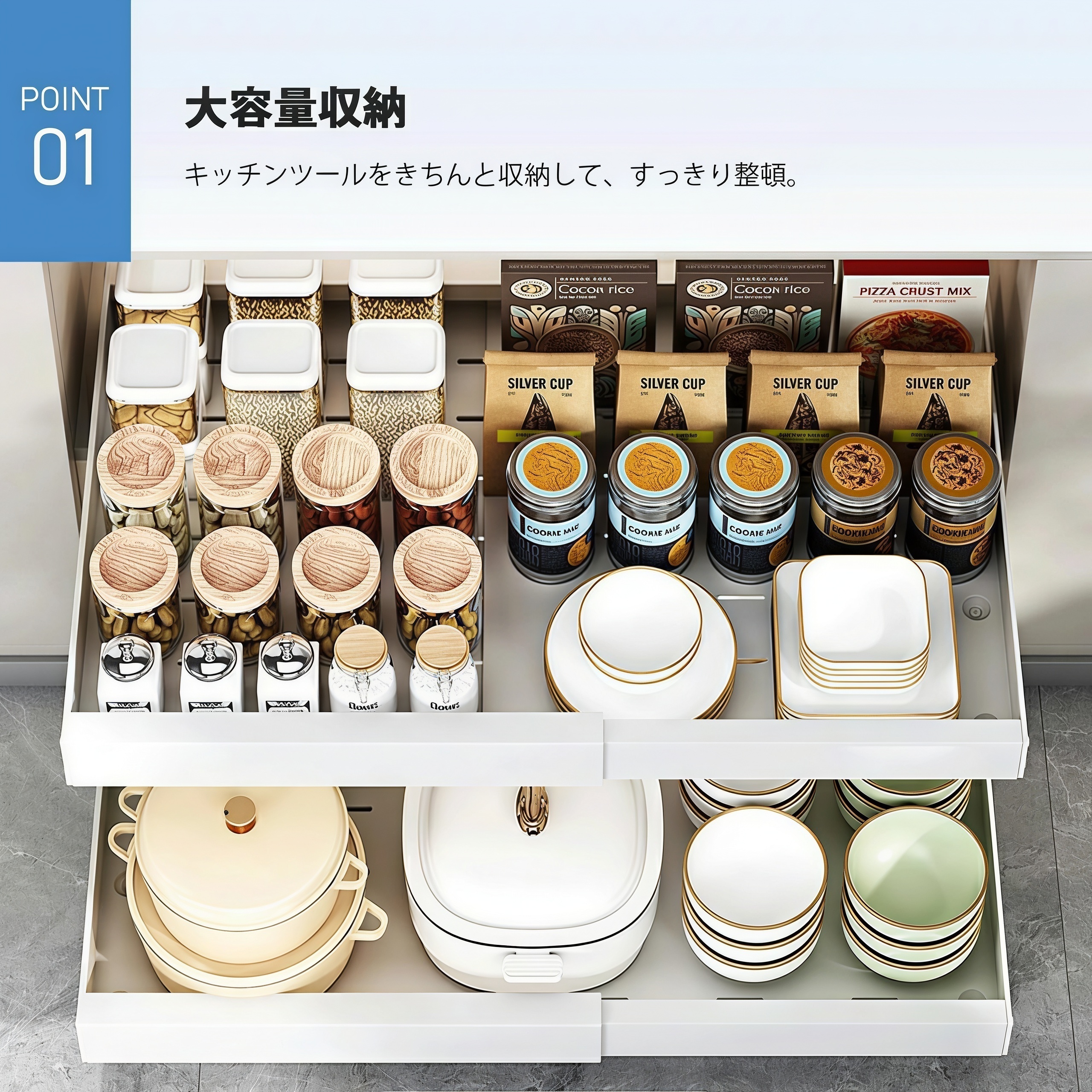 - 大容量分類収納:食器コーナーと調味料コーナーに分けて収納可能。中身が一見で分かり、取り出しも秒で完了。混沌としたキッチンを「見える収納」へと変革。