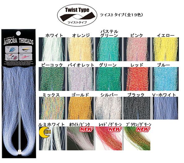 材質は、耐水性に富んだポリエステルを使用し、水中での軽やかな動きと魚が好む鮮やかカラーで、集魚効果抜群です。素材に撚り加工(ツイスト加工)を施すことで、張りのある繊細な動きとアピール力のあるオーロラカラーで集魚効果を発揮します。