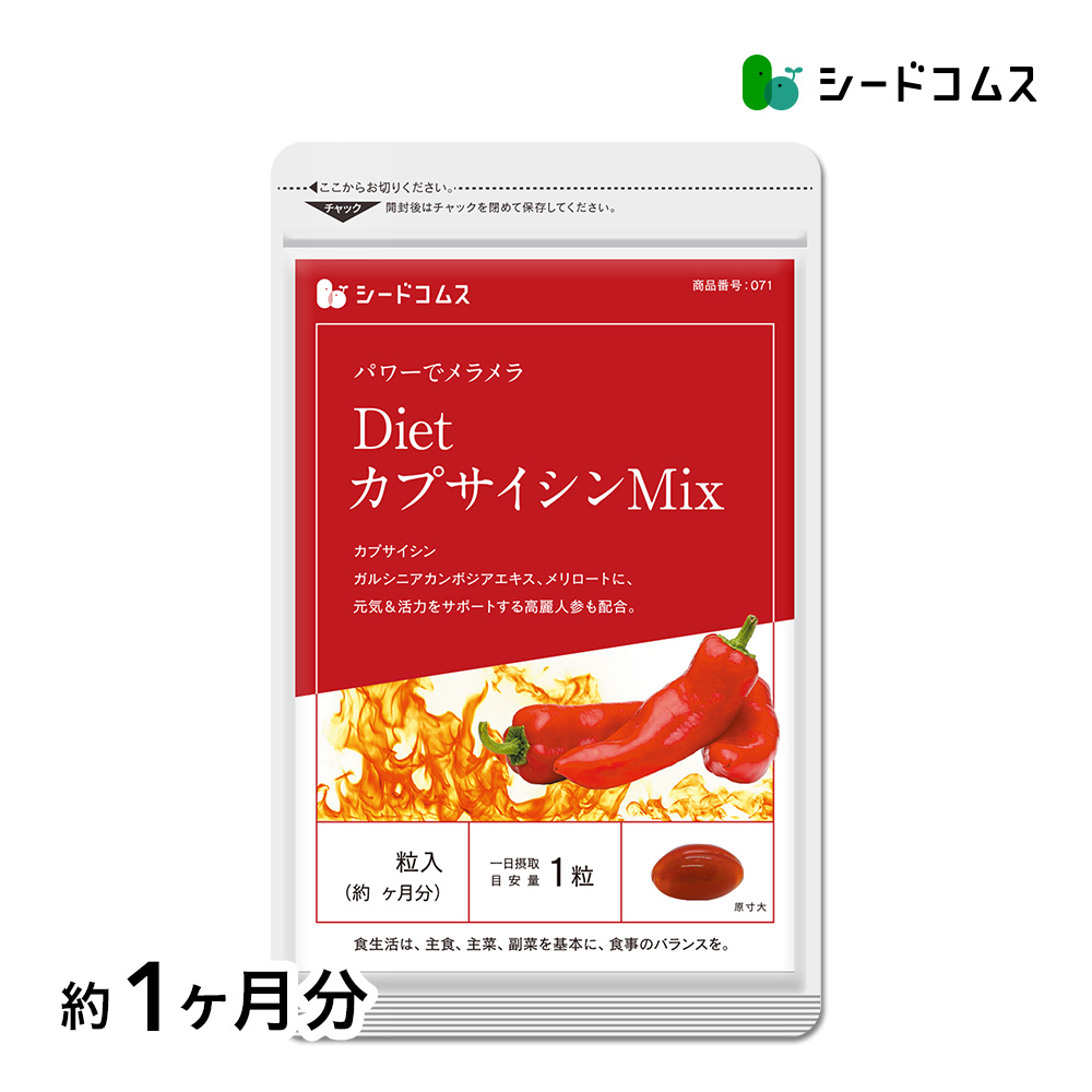 ひまわり油(国内製造)、唐辛子粉末、ガルシニアカンボジアエキス末、高麗人参末(紅参)、メリロートエキス末、ゼラチン、グリセリン、ミツロウ、グリセリン脂肪酸エステル、香辛料抽出物(トウガラシ)、着色料(β-カロチン)、植物レシチン(大豆由来)