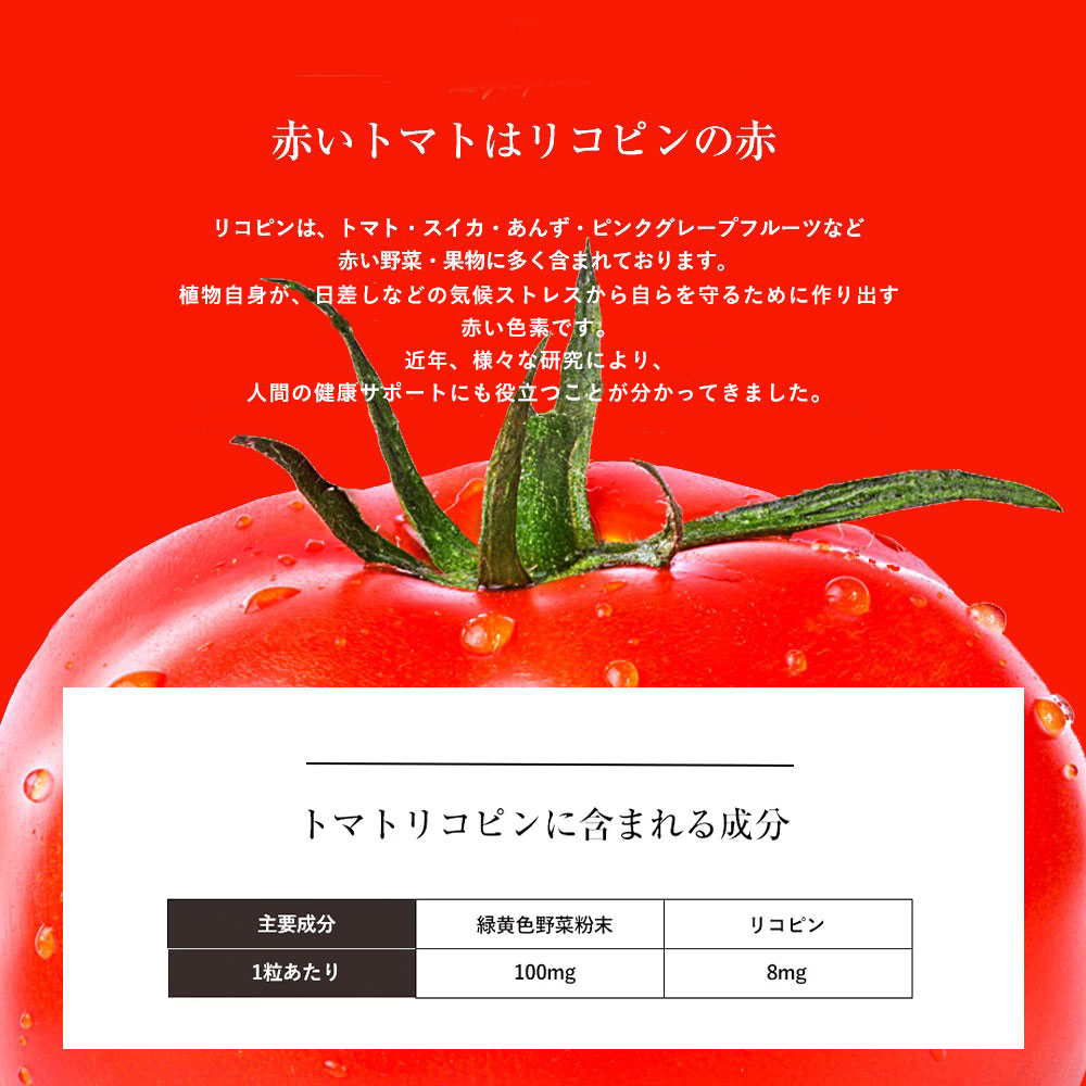 緑黄色野菜粉末(アスパラガス、オクラ、カボチャ、ケール、コマツナ、ダイコン葉、パセリ、ブロッコリー、ホウレンソウ、ヨモギ)(国内製造)、こめ油、サフラワー油/ゼラチン、グリセリン、グリセリン脂肪酸エステル、トマトリコピン