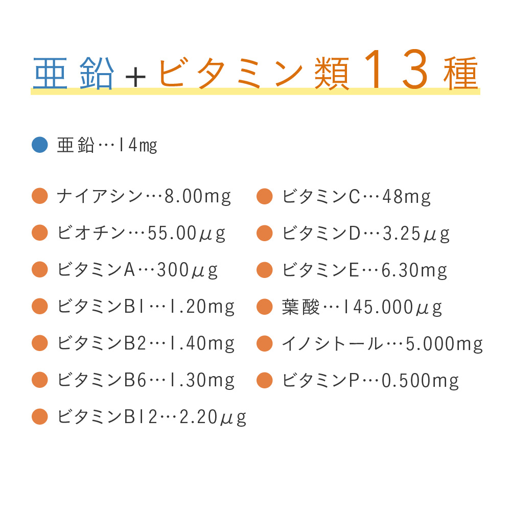 還元麦芽糖水飴(国内製造)、ビタミンE含有植物油、乳糖(乳成分を含む)/グルコン酸亜鉛、セルロース、ビタミンC、ナイアシン、加工デンプン、パントテン酸Cα、イノシトール、ステアリン酸Cα、ビタミンB6、ビタミンΒ2、ビタミンΒ1、糖転移ビタミンP、ビタミンA、葉酸、ビオチン、ビタミンD、ビタミンΒ12