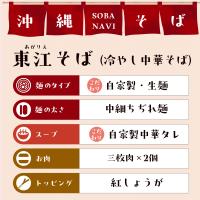 | 栄養成分表示 | 【東江そば】エネルギー923kcal/たんぱく質32.5g/脂質51.2g/炭水化物74.1g/食塩相当量6.7g(1食当たり) 【冷やし中華そば】エネルギー926kcal/たんぱく質30.8g/脂質30.2g/炭水化物138.1g/食塩相当量9.2g(1食当たり) |