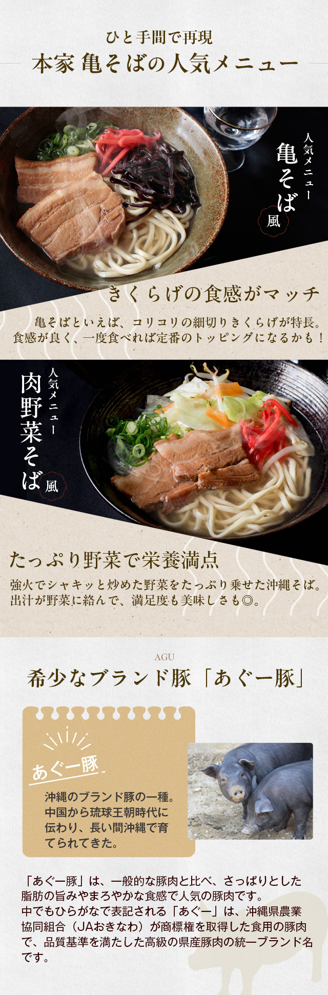 | 原材料名 | 【麺】小麦、粉末状小麦たん白、なたね油、冠水、食塩 【スープ】鰹節、昆布、あぐー豚骨だし、醤油、食塩、みりん/アミノ酸等 【肉】豚肉、醤油、みりん、砂糖、料理酒、生姜 |