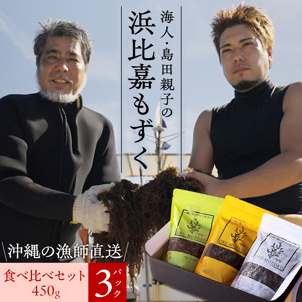 沖縄県浜比嘉島から直送 海人 島田親子の浜比嘉もずく(早摘み・成熟・完熟の食べ比べセット)450g×3パック入り 洗いもずく 生もずく 塩抜き不要 送料無料