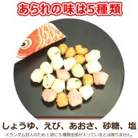 | 主な仕様 | テトラ個包装約46個入り。※重量換算のため個数は前後します。小袋は小さいお子さまの手にも納まりやすいテトラ型です。5種類の味(醤油、えび、あおさ、砂糖、塩)の薄味の小粒あられが入っています。カラフルなこいのぼりがプリントされた小袋にあられが約10粒入っています。※ランダム封入のため、5種類の味全部が入っているとは限りません。原材料:もち米(国産)、醤油(大豆・小麦を含む)、砂糖、食塩、海老、青さ、水あめ/調味料(アミノ酸等)、紅麹色素 |