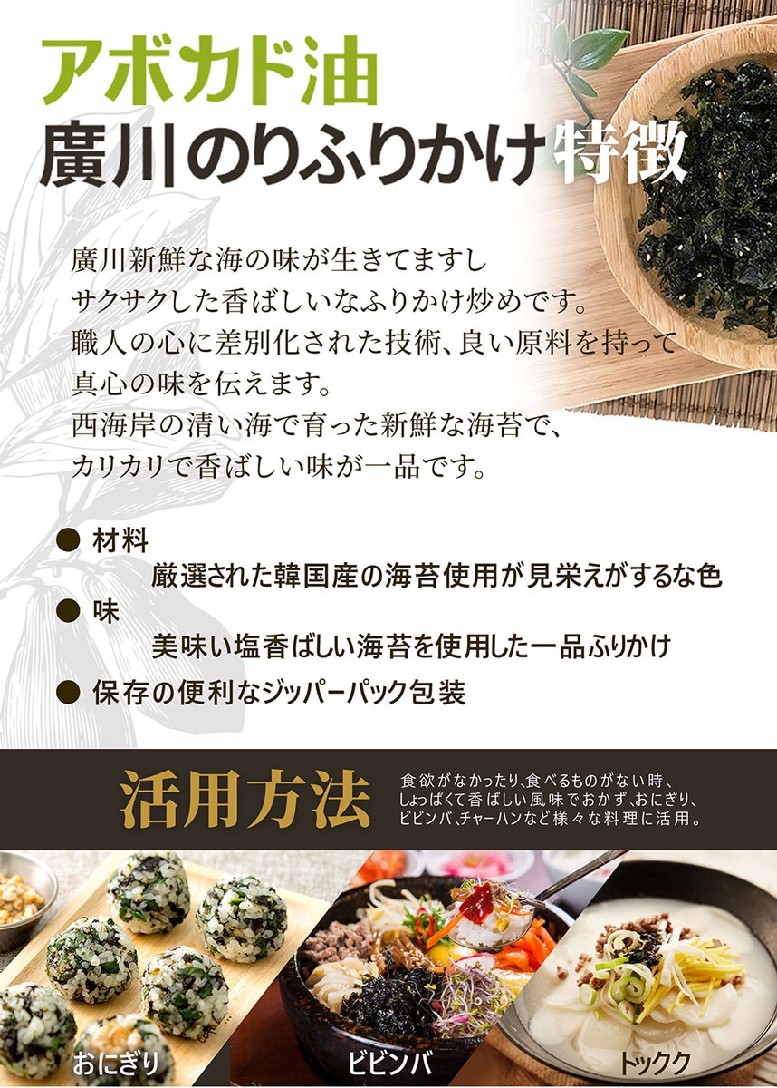 ■ 原材料:乾燥のり(韓国産)、コーン油、食塩(韓国)、アボカド油(メキシコ)、ごま油、ごま、砂糖(韓国)