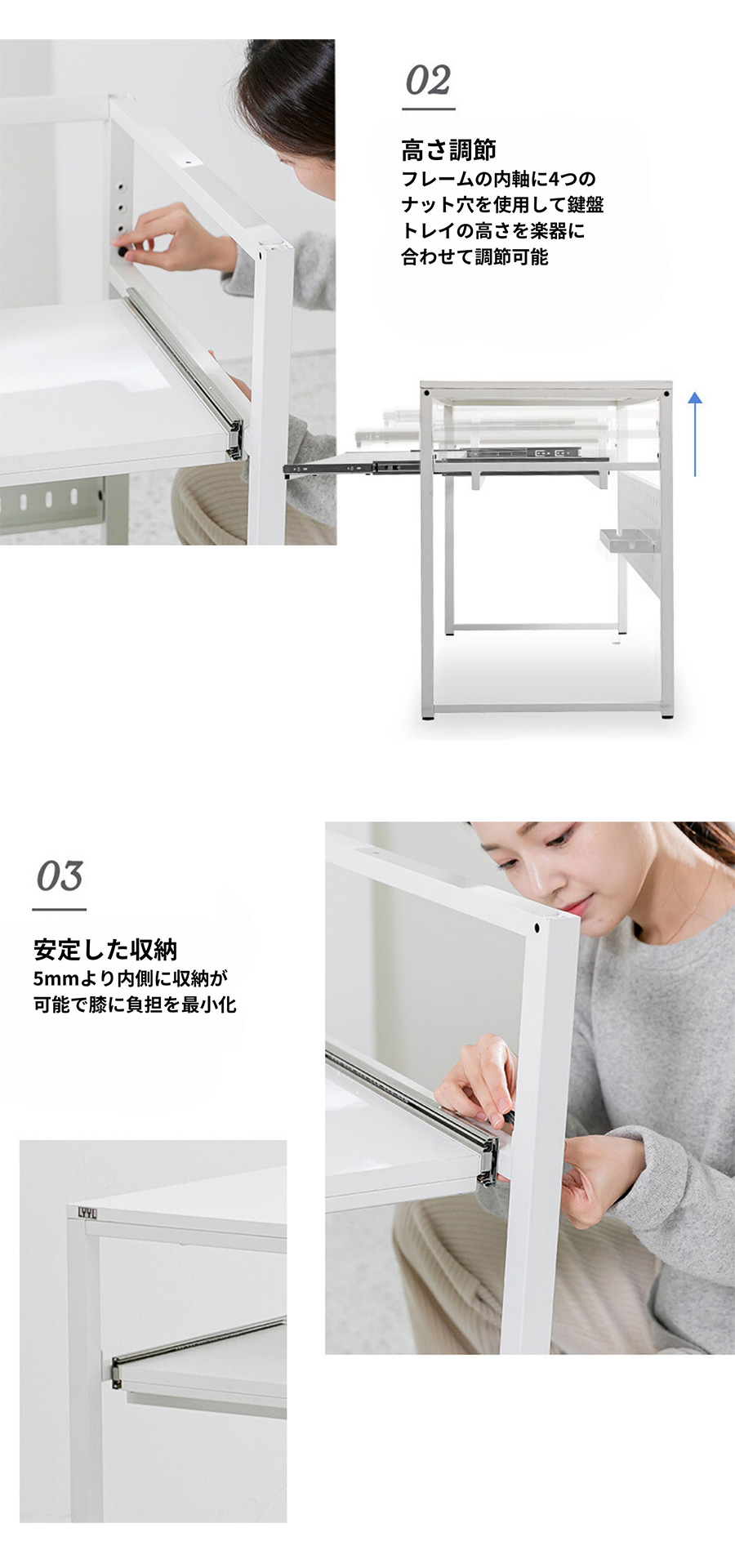 世界初の高さ調節可能、キーボード収納トレー。