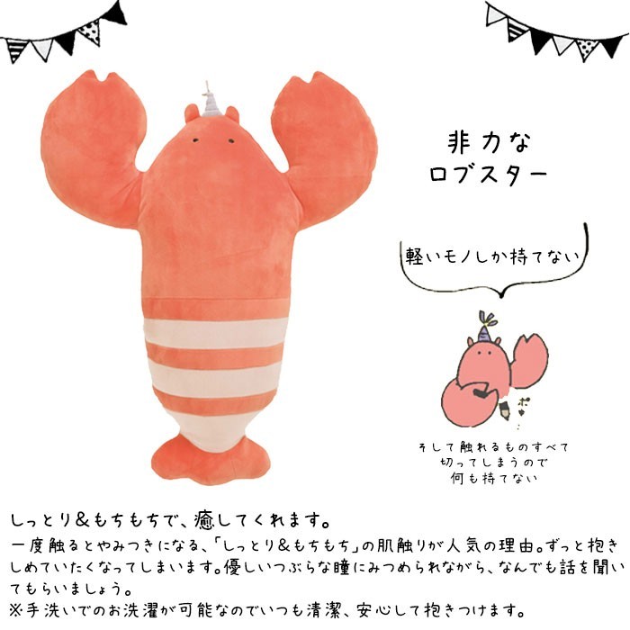 | < size="2" color="#000000">商品詳細> | < size="2" color="#000000">お揃いのパーティー帽をかぶったヘンテコでどこか愛らしい動物たち、「ルーミーズパーティー」シリーズの抱き枕です。 キャラクターそれぞれにちょっとおかしくて可愛らしい設定があり、愛着が湧くこと間違いなしです。 こちらの商品は、軽いものしか持てない「非力なロブスター」がモチーフになっています。 いつでも話を聞いてくれそうな、優しくてつぶらな瞳をしています。 一度触るとやみつきになってしまう、もっちり&しっとりのマシュマロタッチです。 手洗いでのお洗濯が可能なので、衛生面も安心です。 こちらは抱き枕Mサイズです。 > |