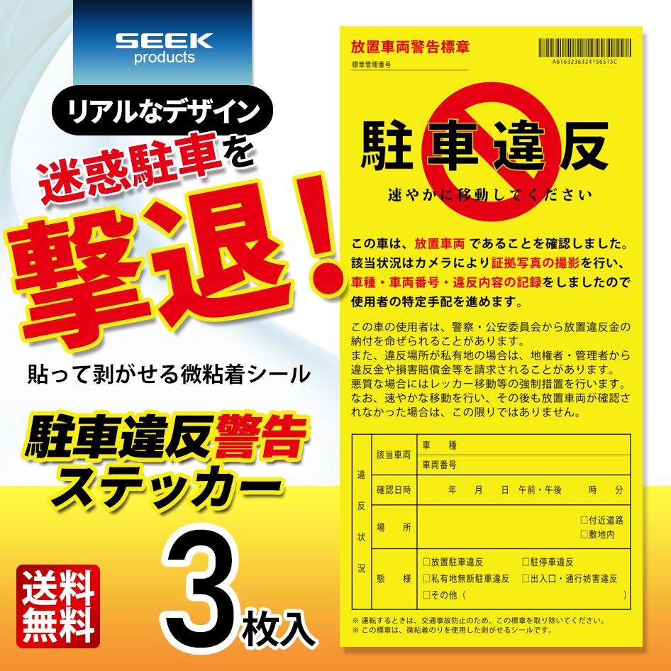 SEEK products 迷惑駐車撃退シール 3枚入 駐車違反警告ステッカー 放置車両 駐車禁止 リアルなデザイン 手書き欄付き 185x90mm 日本製