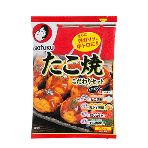 [たこ焼粉]小麦粉(国内製造)、食塩、麦芽糖、デキストリン、でんぷん、砂糖、かつお節粉末、昆布エキス粉末、植物油脂、卵白粉/トレハロース、加工でんぷん、調味料(アミノ酸等)、ベーキングパウダー、増粘多糖類、(一部に小麦・卵・乳成分を含む) [天かす天華]小麦粉、植物油脂、いか天(小麦粉、植物油脂、するめ、でんぷん、その他)、いか粉、食塩、ぶどう糖、唐辛子/調味料(アミノ酸等)、乳化剤、香辛料抽出物、(一部に小麦・いかを含む) [乾燥紅しょうが]しょうが酢漬(しょうが、食塩、醸造酢)、麦芽糖、ぶどう糖、食塩/酸味料、着色料(アカダイコン色素)、調味料(アミノ酸等) [青のり]すじ青のり(国産)