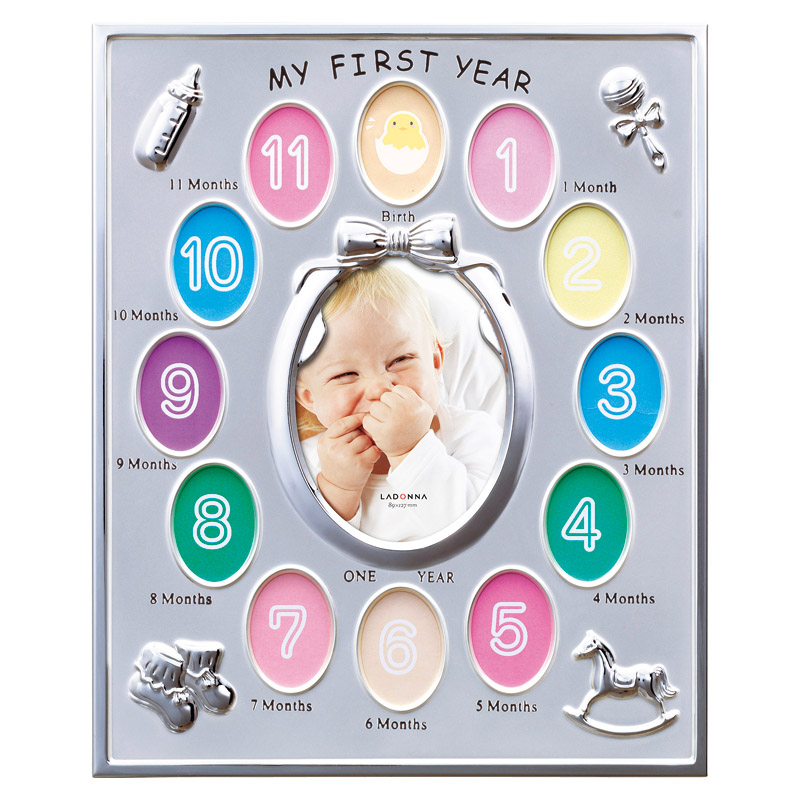 かわいい赤ちゃんの誕生から1年間12ヶ月分の写真を入れていけるフォトフレームです。置掛兼用。