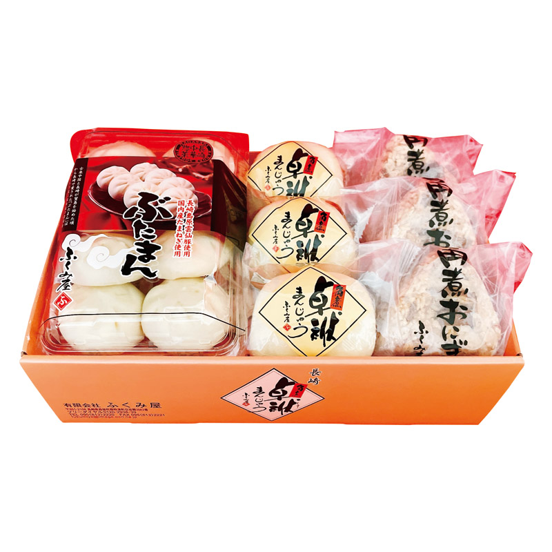 ●内容:長崎ぶたまん(26g)×8、角煮卓袱まんじゅう(60g)・角煮おにぎり(105g)×各3