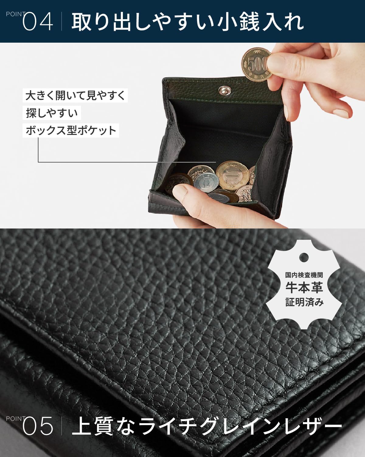 【使いやすさに長けた小銭入れ】使う頻度が最も高い 小銭入れ スペースを開かずに、表側の位置で BOX 型にすることでこれまでにない使いやすさを実現します。 硬貨 を余分に入れても収納可能な大容量設計。