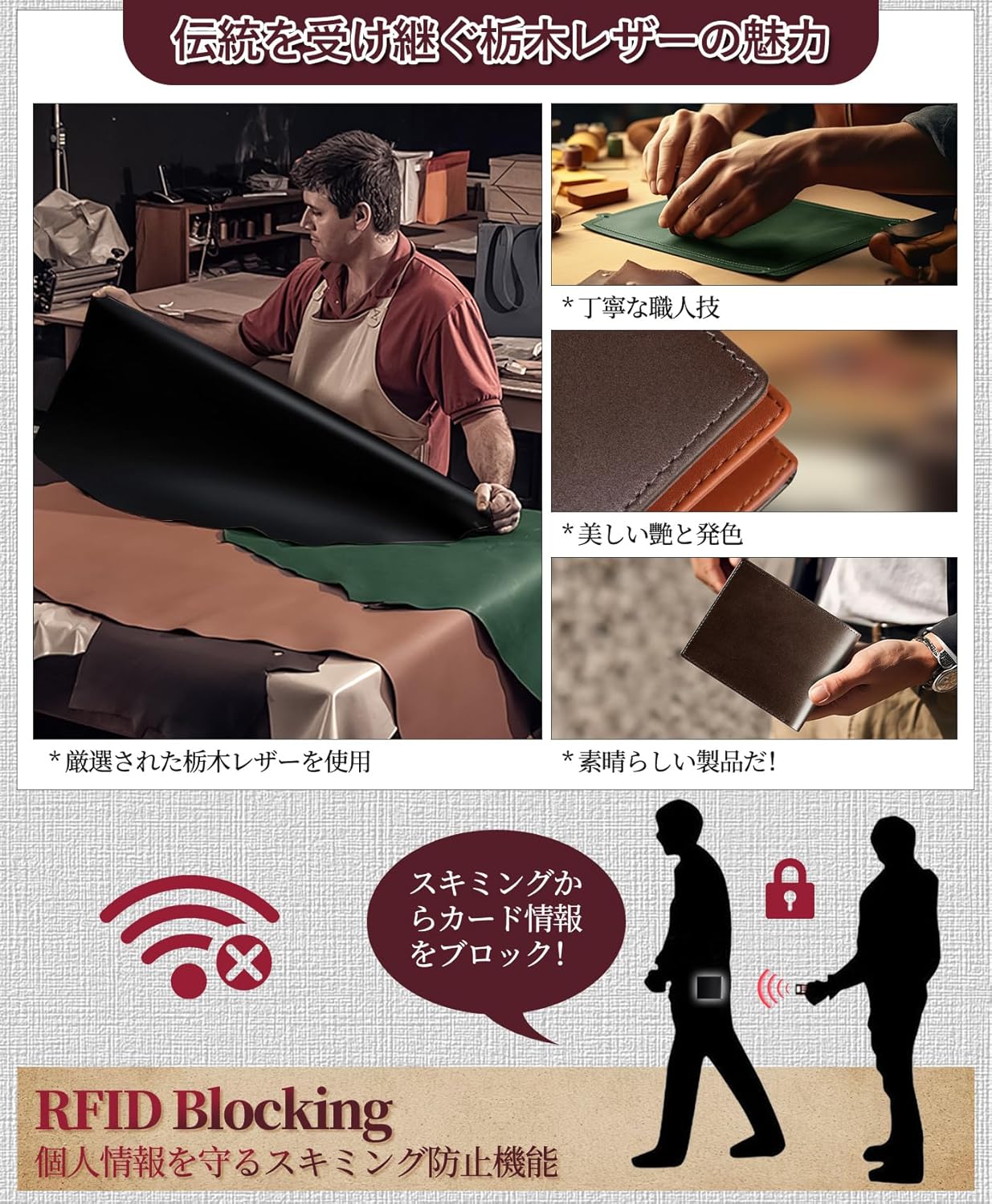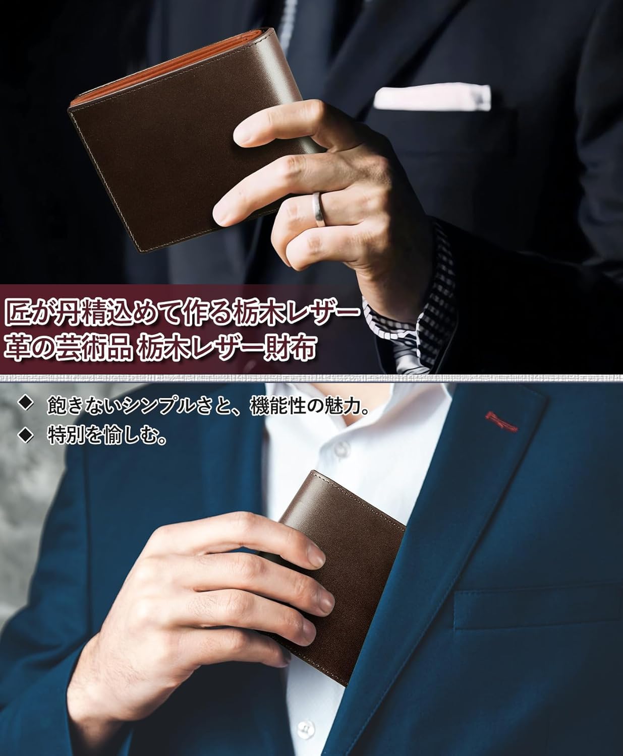 【革の芸術品 栃木レザー財布】厳選された栃木県産皮革を贅沢に使用した二つ折り財布。職人による伝統的な鞣し技術で生まれる深みのあるシボと、時間と共に味わい深く変化する「経年美化」が特徴です。ビジネスシーンにも映える、本物の皮革が持つ品格です。