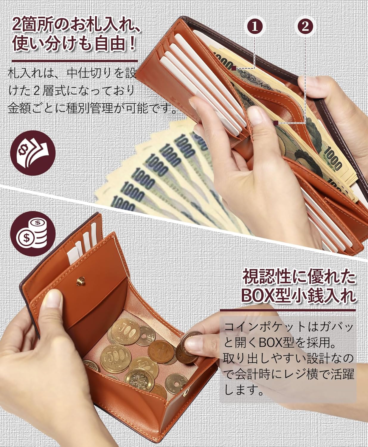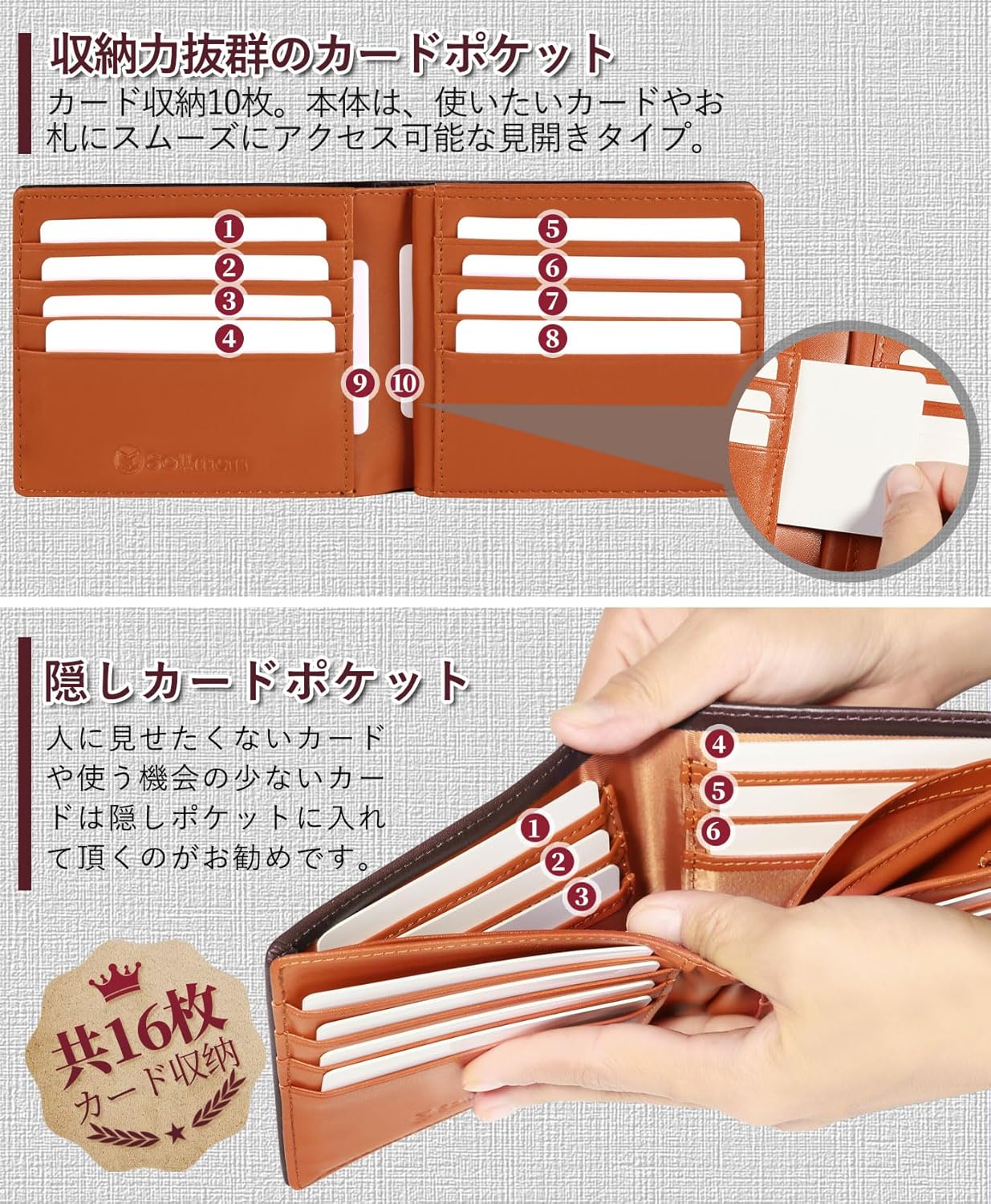 【財布仕様】◆サイズ :横幅11.8cm×縦幅9.7cm×厚み1.8cm、重さ99g ◆収納力:カード16枚収納(隠しカードポケット×6)、札入れ ×2、ボックス型小銭入れ×1、スキミング防止機能搭載(RFID Blocking)◆カラー:ブラック/ブラウン/グリーン/ブラック(内側ブラック)/ブルー/ダークブラウン