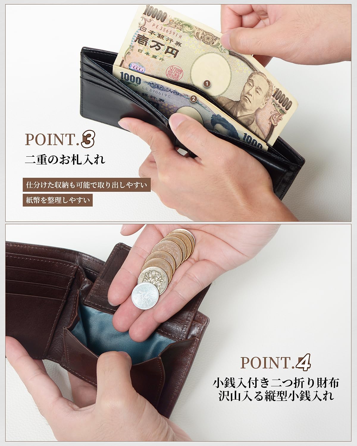 【使いやすい財布 メンズ】薄型でありながら大容量の小銭入れつきの二つ折り財布で、カード入れは9枚分つき。お札収納?2ヵ所、小銭入れ?1ヵ所 。レシートやチケットなどの収納までも、いつでも綺麗に整理できます。財布のサイズは11×9×1.3cmで、コンパクトサイズなのでポケットにすっきりと収まり、重さはわずか70gで持ち運びに便利です。使いやすいボックス型の小銭入れは、 取り付け位置に工夫することで、 一目で見やすく、取りだしやすくなりました。
