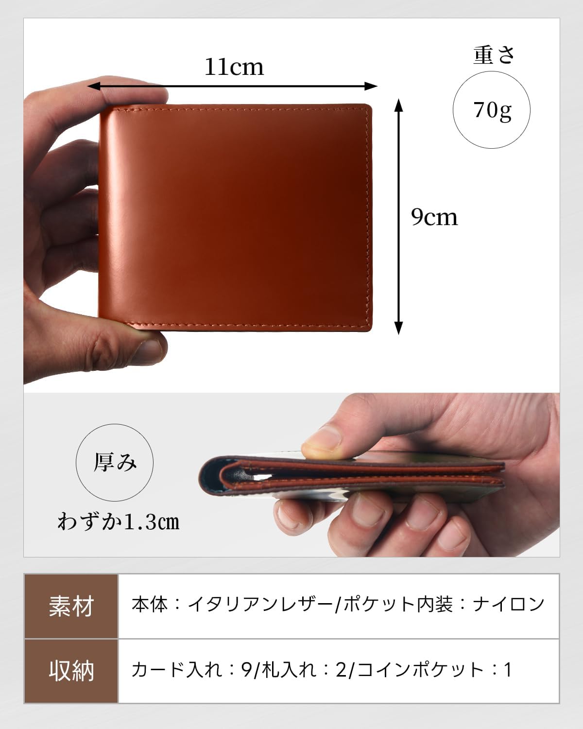 財布 メンズ 2つ折り イタリアンレザー 本革 ウォレット カード9枚収納 お札 小銭入れ 薄型 軽量 一流の革職人が作る 折りたたみ財布 サイフ 紳士用 レディース