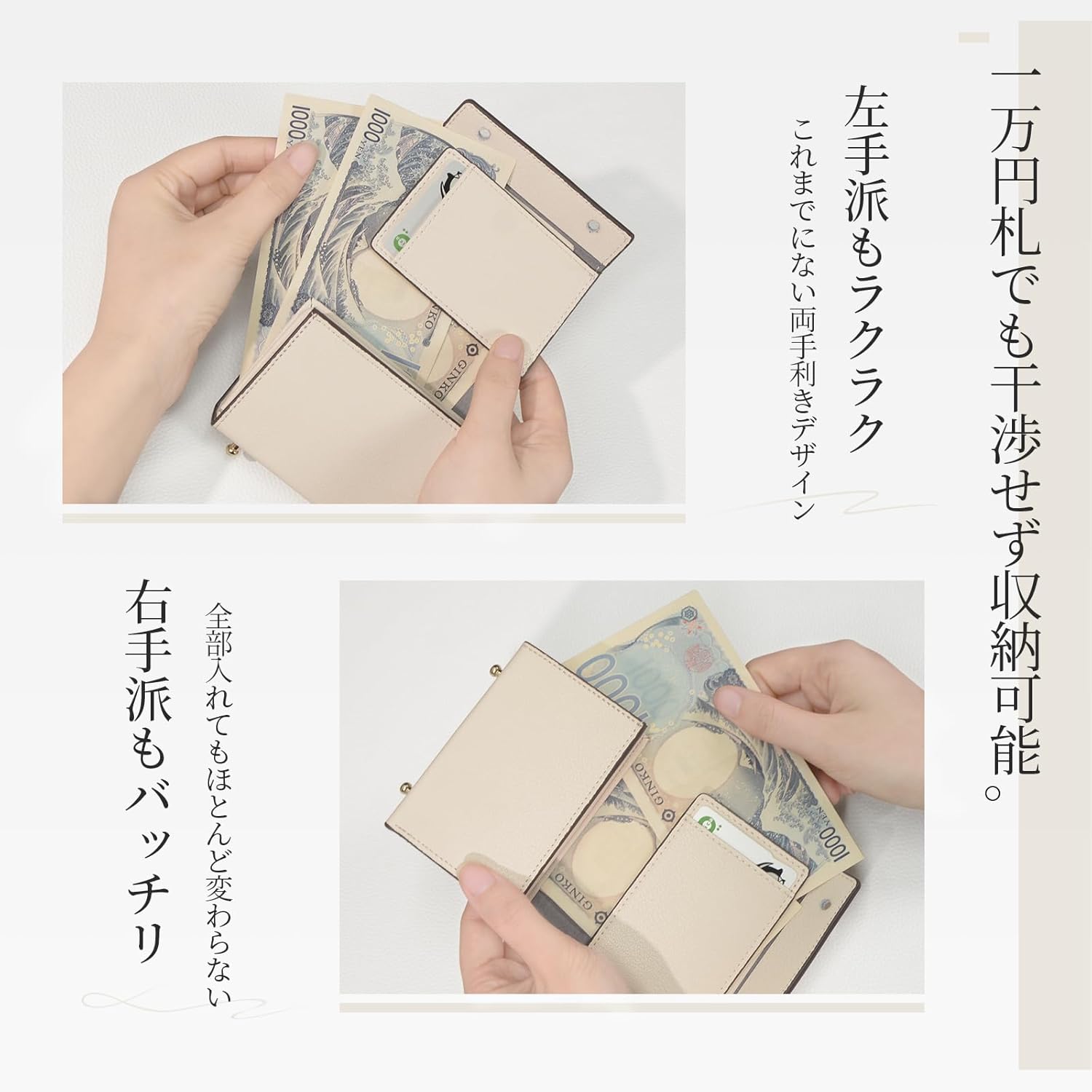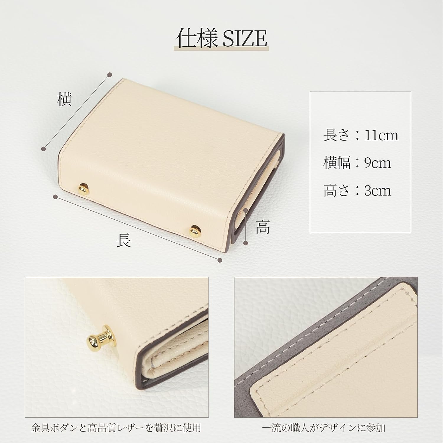 【高級感のある牛革製】細かいシボ感が特徴の上質な本牛革を使用しており、手触りも非常に良いです。カードや小銭、お札を収納してもすっきりと収まり、主財布としてもサブウォレットとしても幅広く活躍するアイテムです。【薄型設計】わずか1cmの厚さで、キャッシュレス社会にぴったり。ミニバッグにもすっきり収まり、コンパクトでありながら実用性も抜群です。軽量で持ち運びも便利です。【マチ付き小銭入れ】取り出しやすいL字型ファスナーを採用し、マチ付きで大きく開きます。小銭の取り出しがスムーズで、使い勝手抜群。内布は明るいベージュで視認性も良好、使うたびに便利さを実感できま【長財布並みの収納力】カード収納は6か所、オープンポケットが2つ。カードは1か所に2枚重ねて収納可能で、10枚以上入れることができます。オープンポケットにもカードや免許証、保険証などを安心して収納できるので、便利でセキュリティも完備。お札は最大10枚、小銭は約30枚まで収納可能。十分な収納力を備えつつ、デザインはスマートで上質なミニ財布です。
