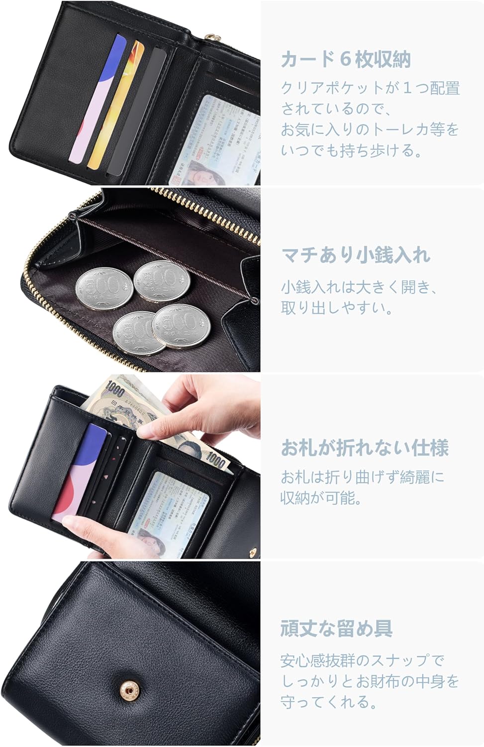 ?商品仕様:お札入れ:1ヶ所 ・小銭入れ:1ヶ所(ファスナー付き)・カード入れ:3ヶ所・IDウィンドウ:1ヶ所・内ポケット:オープン×2。カード最大6枚収納でき、コンパクトなサイズですが、小銭、お札、レシート、カードなど楽々に収納できます。