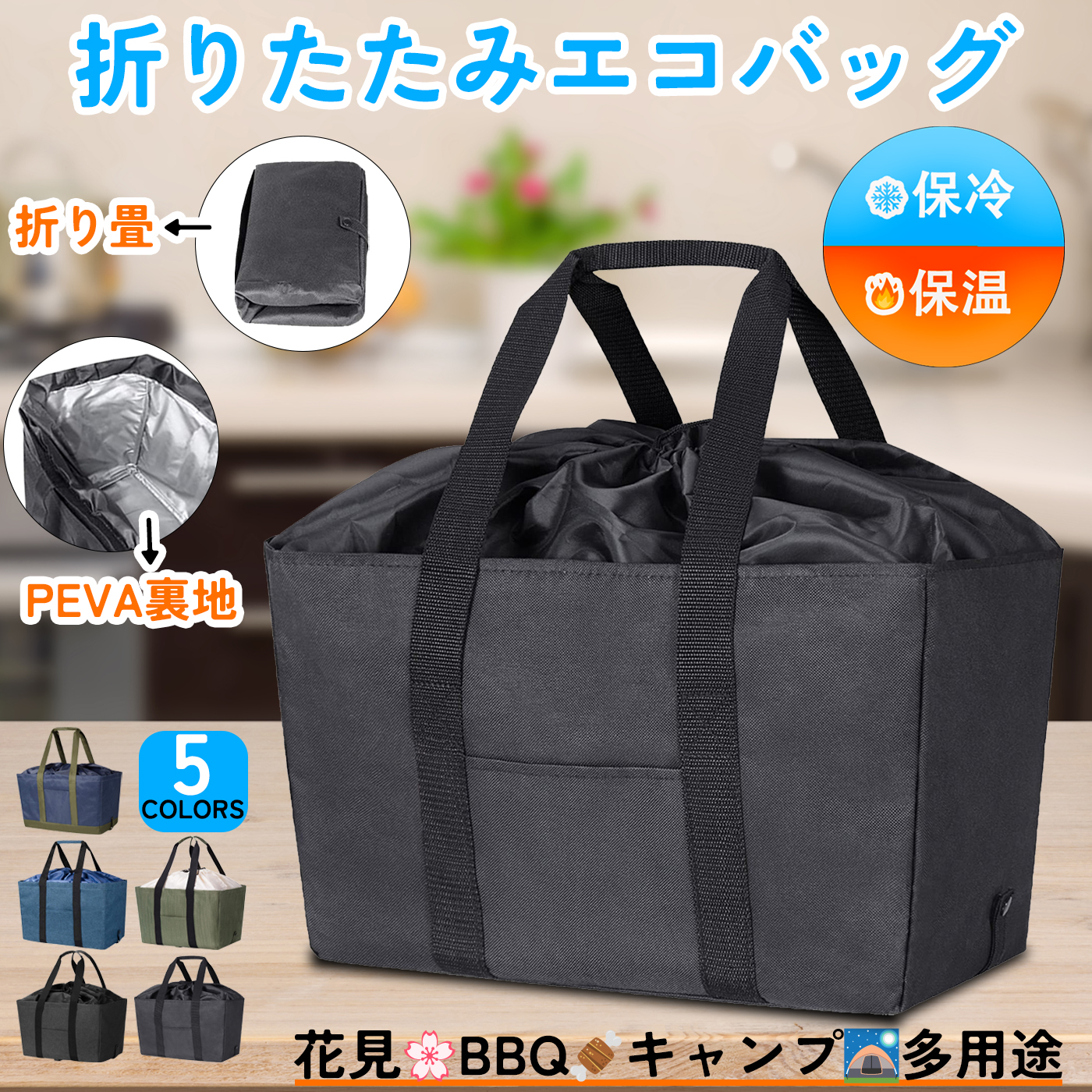 【高品質の素材】 カチオン性生地とPEVA裏地で作られています、優れた保温・保冷効果を発揮します、食材の新鮮さや、冷たい飲み物などそのままキープできます。エコショッピングバッグの中には、ドライアイスと冷却剤を保管する為、特別なメッシュポケットが設置されております。上部は巾着式なので、紐で袋をしぼることができ、食べ物や飲み物が落ちる心配はありません!