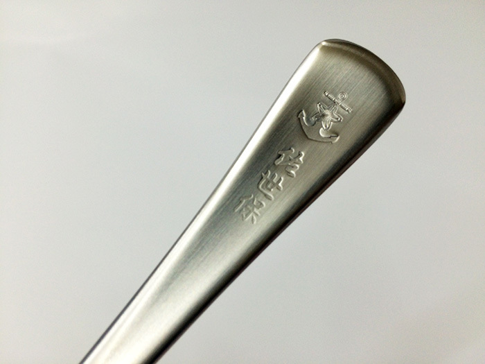 帝國海軍と海上自衛隊のシンボルマークである「桜にイカリ」と「佐世保」が刻まれているカレースプーン。