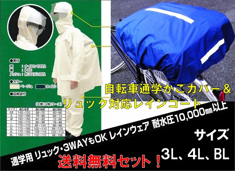 通常サイズの自転車通学用レインコート リュックが背負えるSS〜LL、防水カバーのセットはこちら。