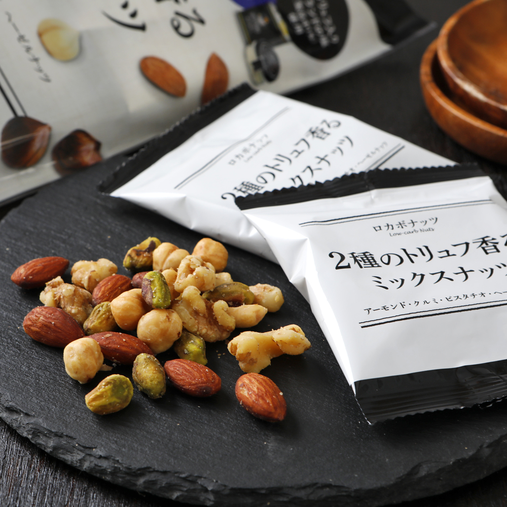 イタリア産白トリュフオイルと黒トリュフ入りゲランドの塩で味付けした香り豊かなミックスナッツです。