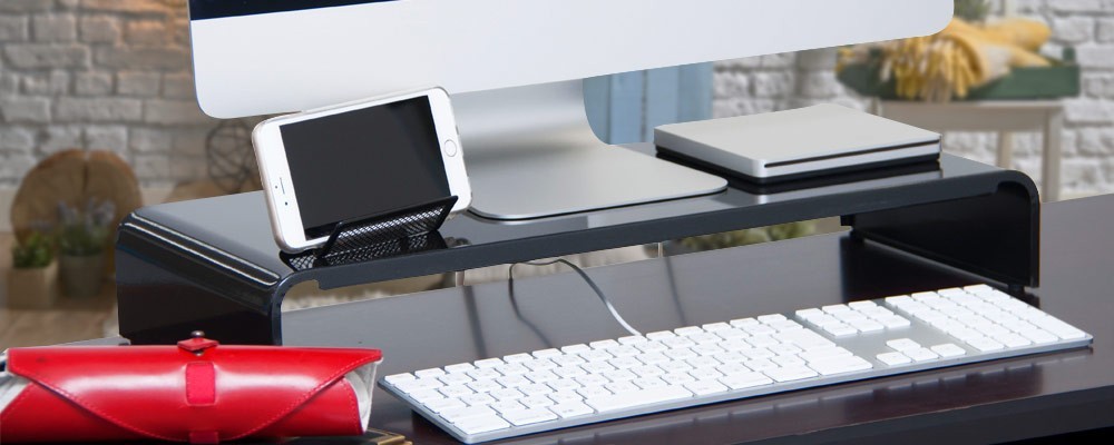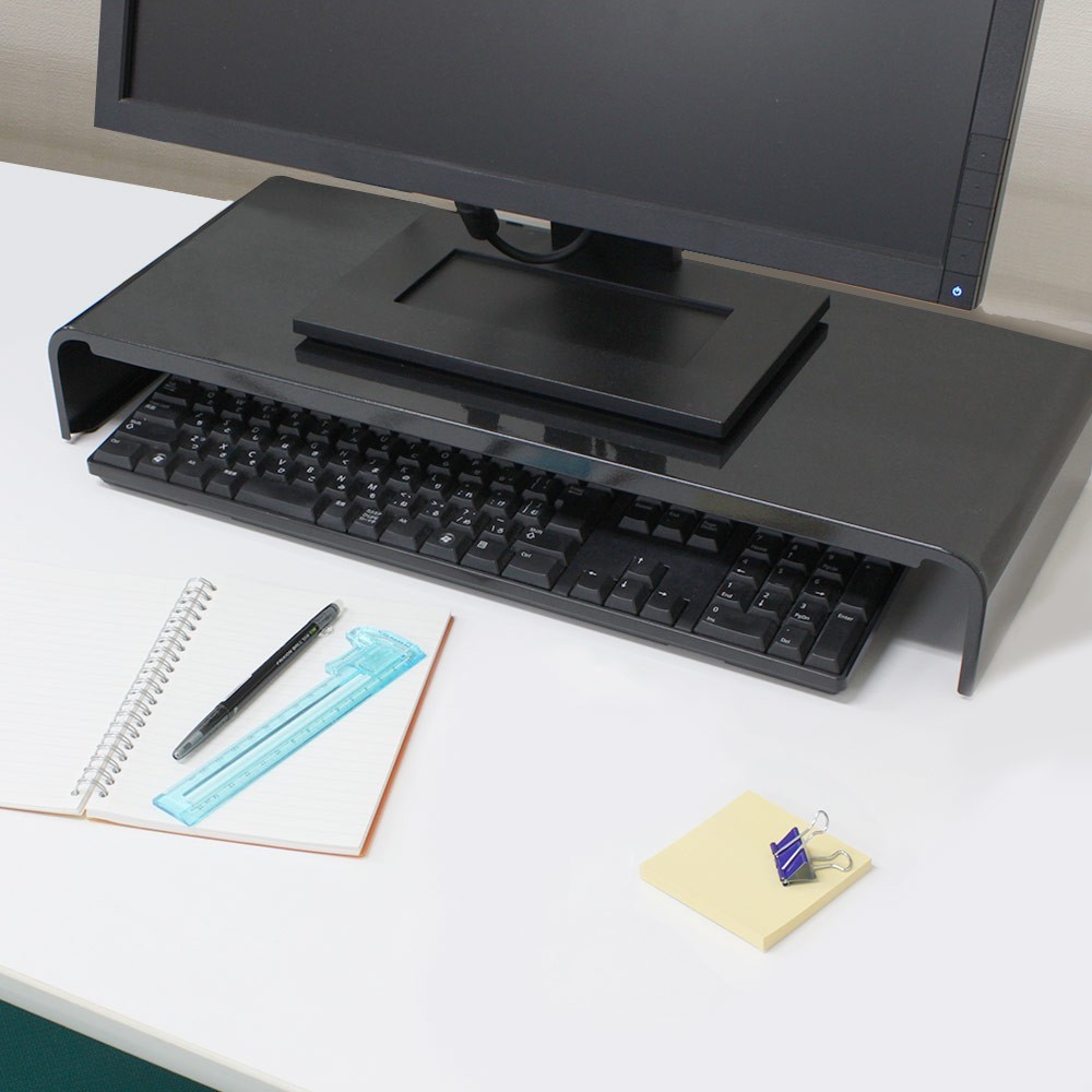 | キーボードをすっきり収納できる便利なPCモニタースタンド。机の上がすっきり片付き、作業スペースが広がります。 | シンプルだけど、耐荷重約20kgと頑丈な作り。背面の配線周りの邪魔をせず、すっきりと設置できます。 | |