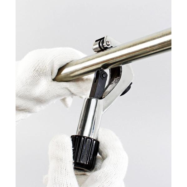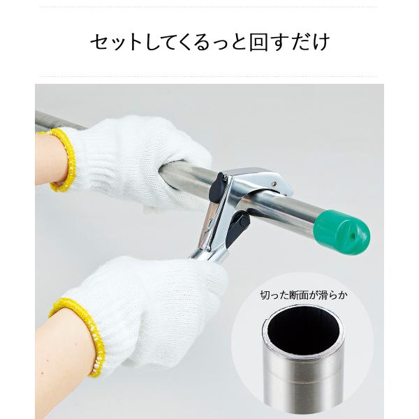 根元のハンドルを回してパイプを挟み、くるっと回すと、パイプがスパッと切れます。