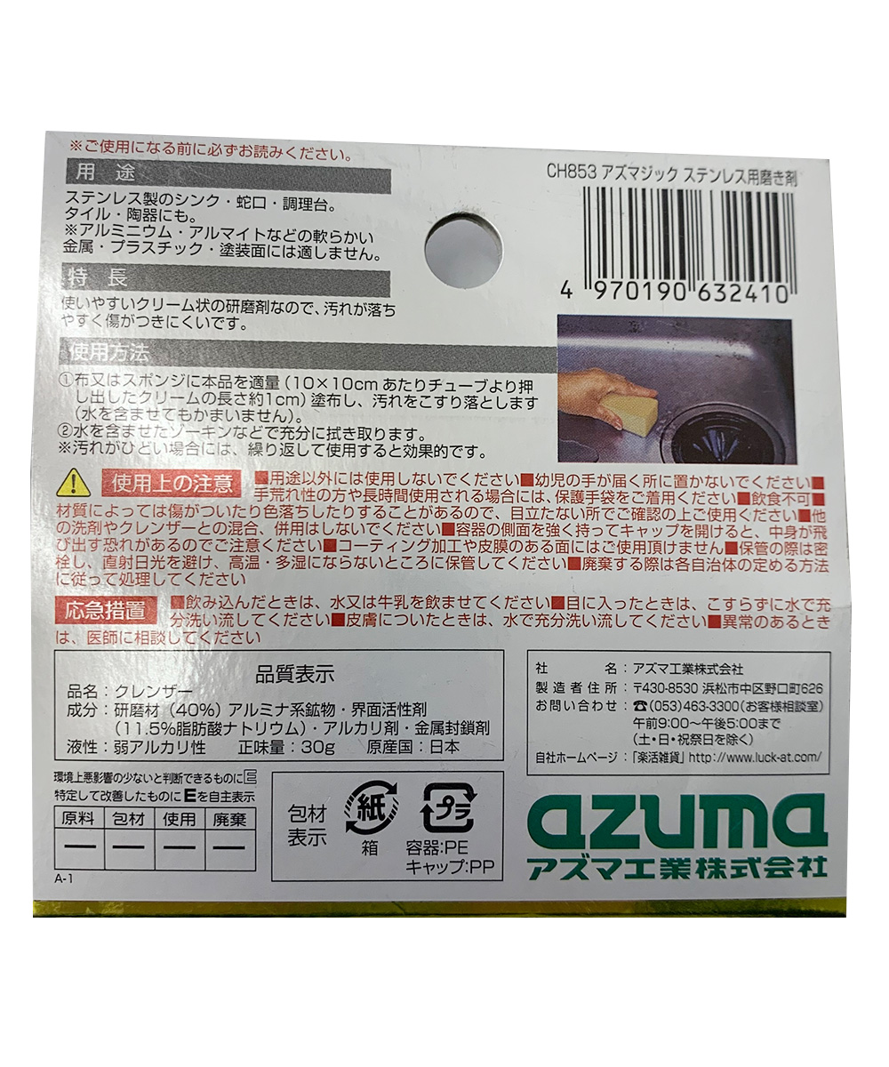 成分:研磨材(40%)アルミナ系鉱物・界面活性剤(11.5%脂肪酸ナトリウム)・アルカリ剤・金属封鎖剤